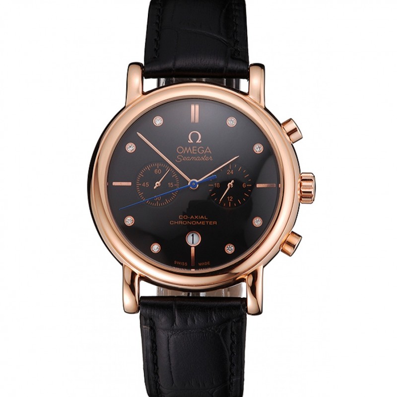 Omega Seamaster Vintage Chronograph Black Diamond cadran heure Marques or rose Bracelet en cuir noir