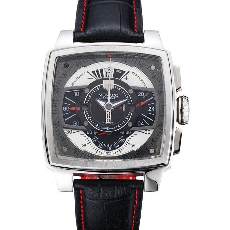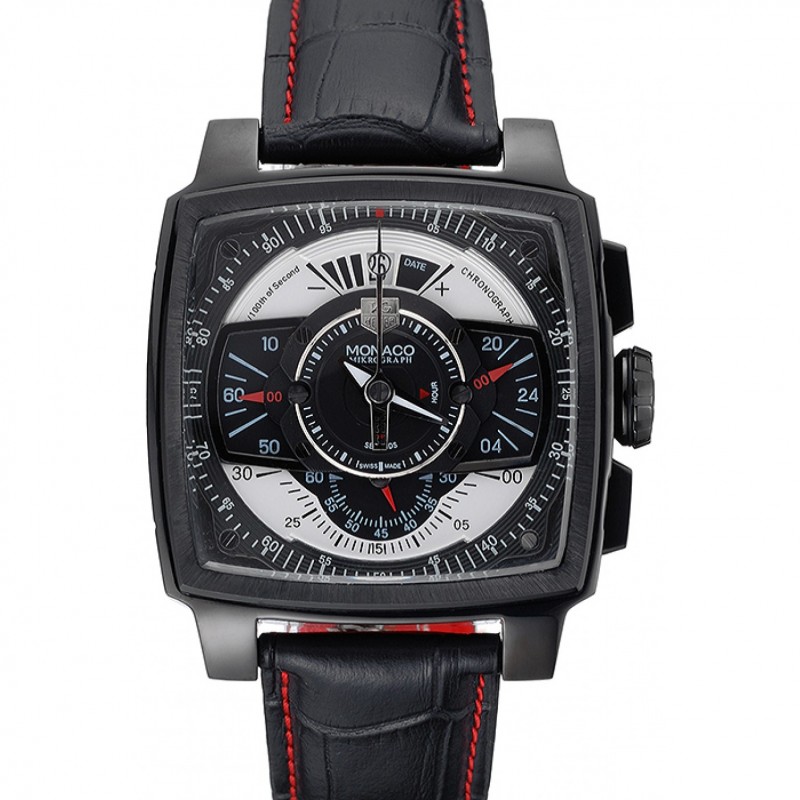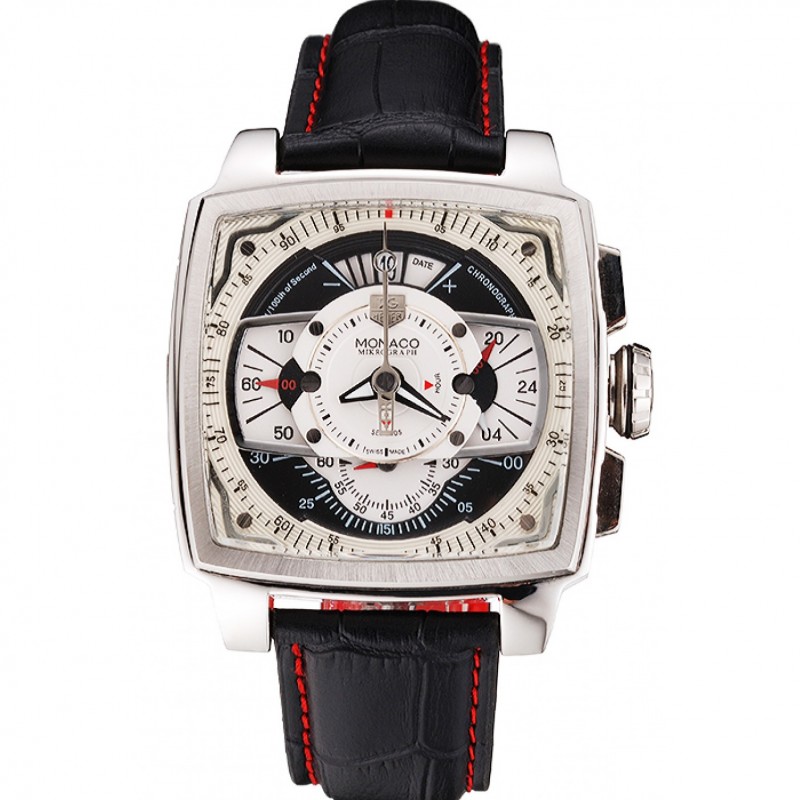 Haut Gamme Replique Montre Tag Heuer Monaco Noir-Rouge Cuir perforé Cadran Blanc 80307