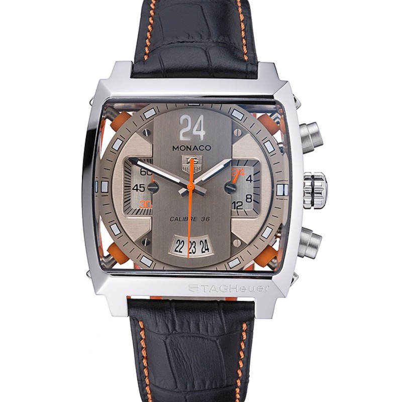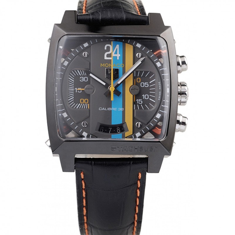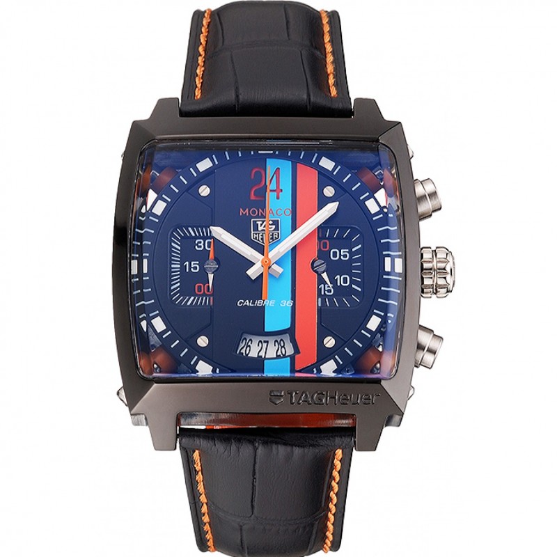 Tag Heuer Monaco Calibre 36 bleu et orange rayures cadran bracelet en cuir noir 622302
