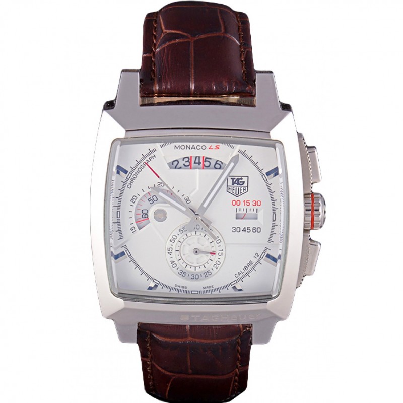 Pas Cher Replique Montre Tag Heuer Monaco brossé cadran blanc Boîtier en acier inoxydable bracelet en cuir brun 98173