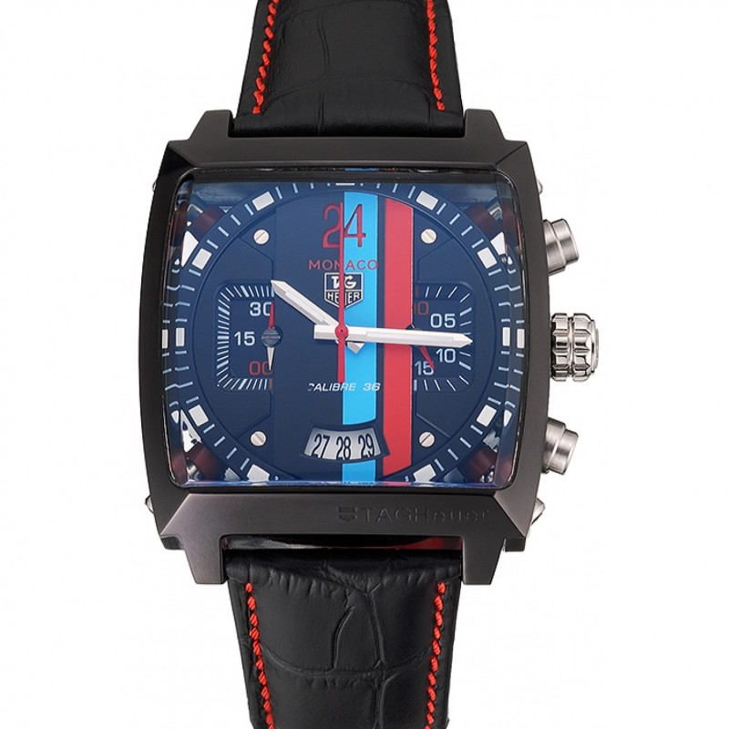 AAA Tag Heuer Monaco Calibre 36 bleu et rouge Dial Stripes cadran bracelet en cuir noir 622272