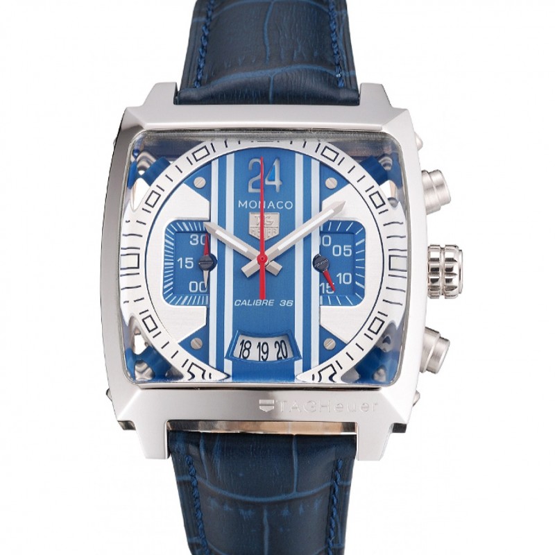 Haut Gamme Replique Montre Tag Heuer Monaco Calibre 24 Chronographe 36 Stripes bleu et gris cadran bleu avec bracelet en cuir 622273
