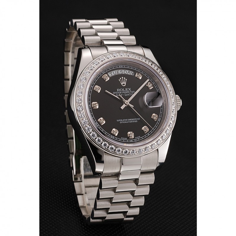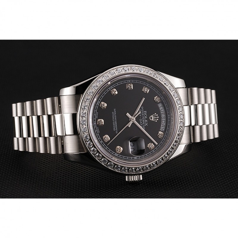 Luxe Réplique Montre Day-Date Rolex Suisse Cadran Noir Diamant Diamant Cas Numerals Bracelet en Acier Inoxydable 1453965