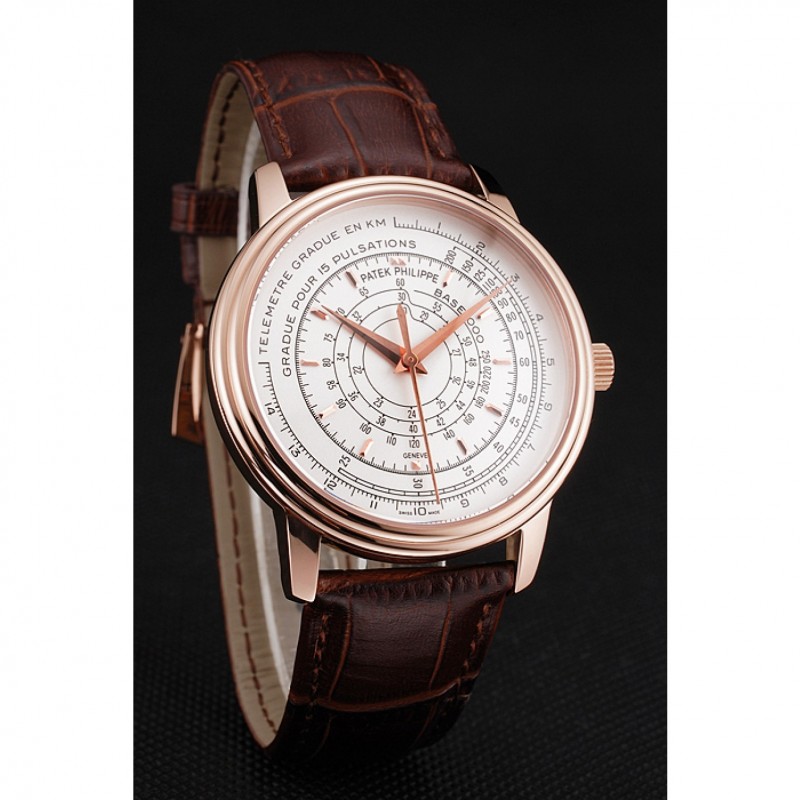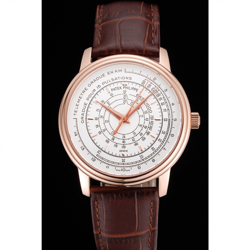Pas Cher Replique Montre Suisse Patek Philippe Multi-Échelle Chronographe Cadran Blanc Or Rose Bracelet en Cuir Brun