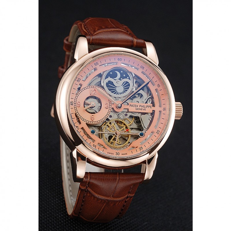 Patek Philippe Dual Time Moonphase Tourbillon Cadran d’or squeletté or rose bracelet en cuir brun
