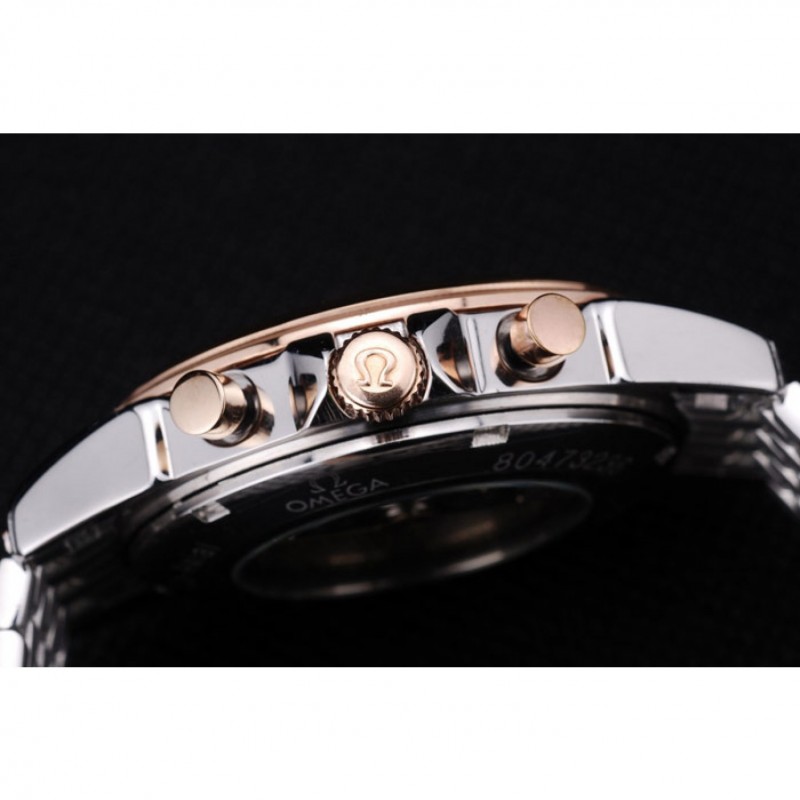 Retour:boîtier en acier inoxydable push-in retour avec inscriptions Omega et le centre transparent qui révèle la mécanique dans les