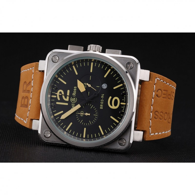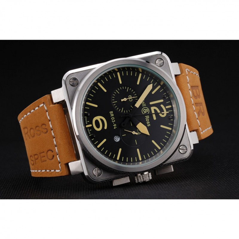 AAA Replique Montre Bell et Ross BR 03-94 Cadran Noir Argent Marron Bracelet en cuir