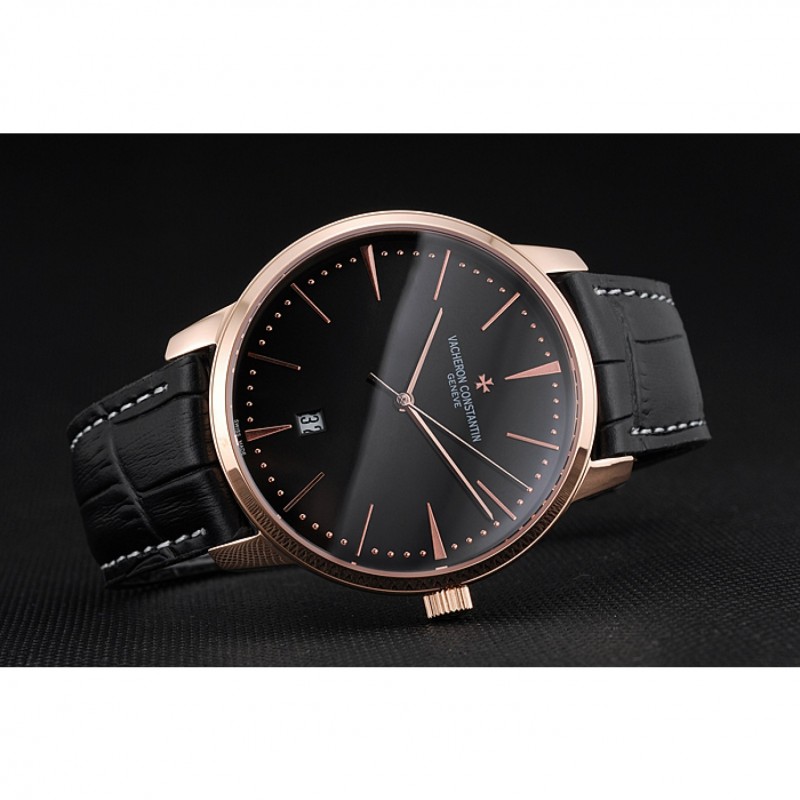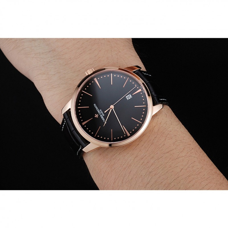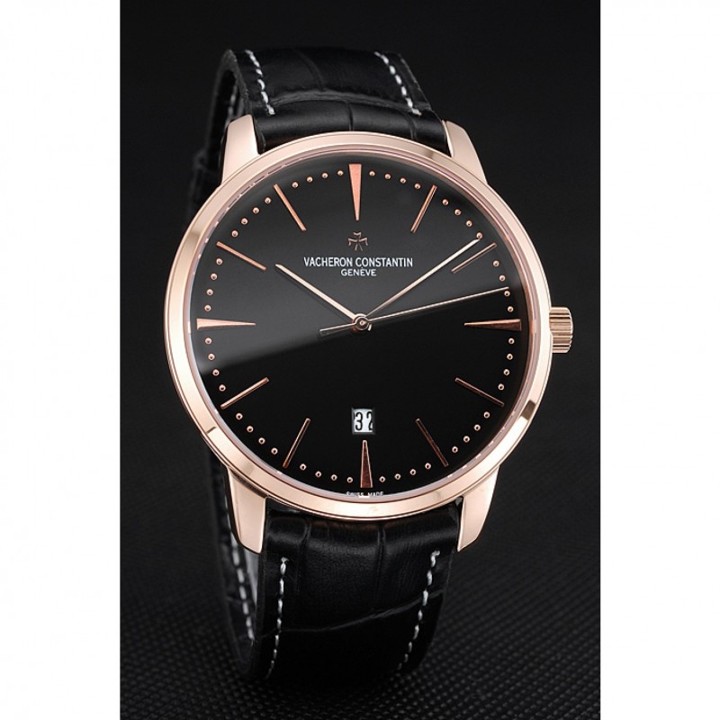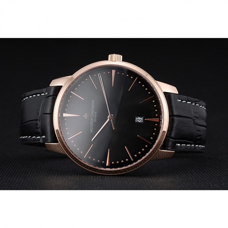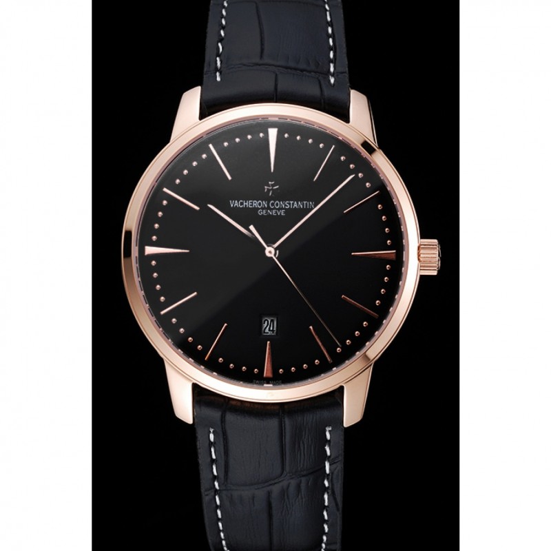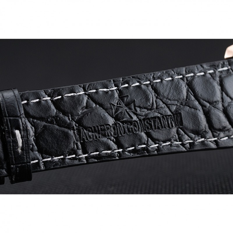 Bracelet:Vacheron Constantin et logo chaleur bracelet en cuir de crocodile noir en relief avec des coutures de fil blanc et logo Vacheron Constantin sculpté 18k or rose plaqué fermoir crochet boucle