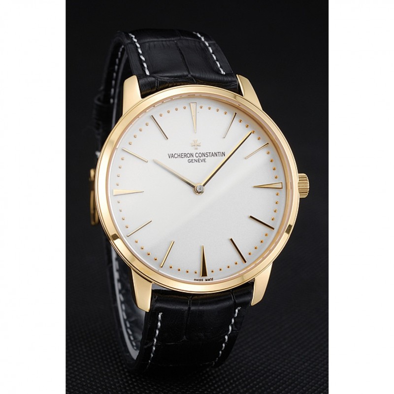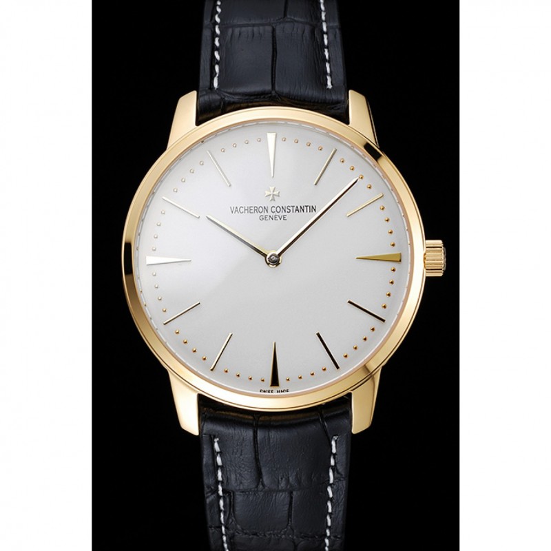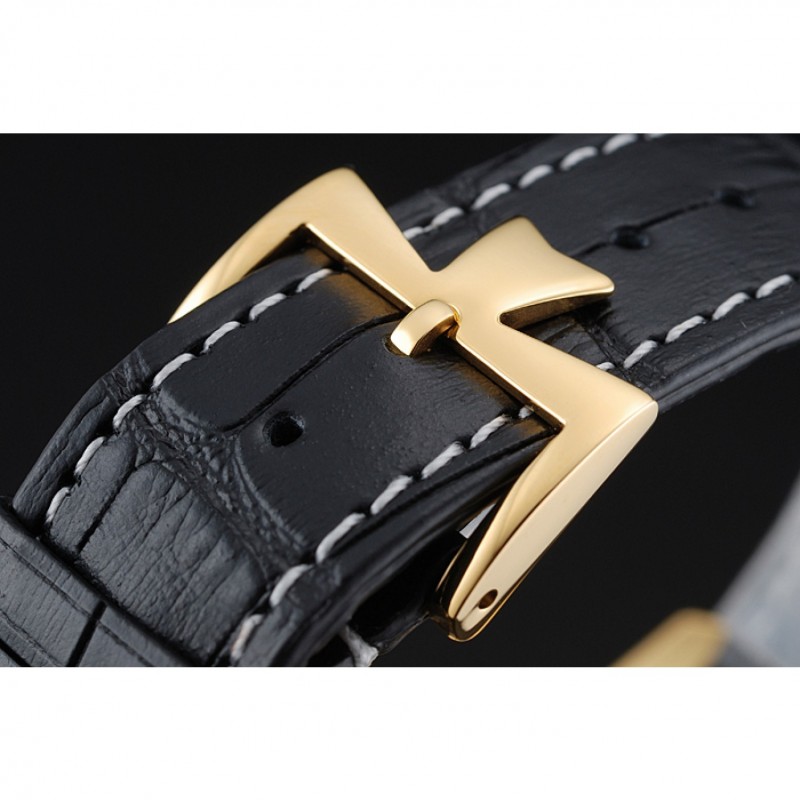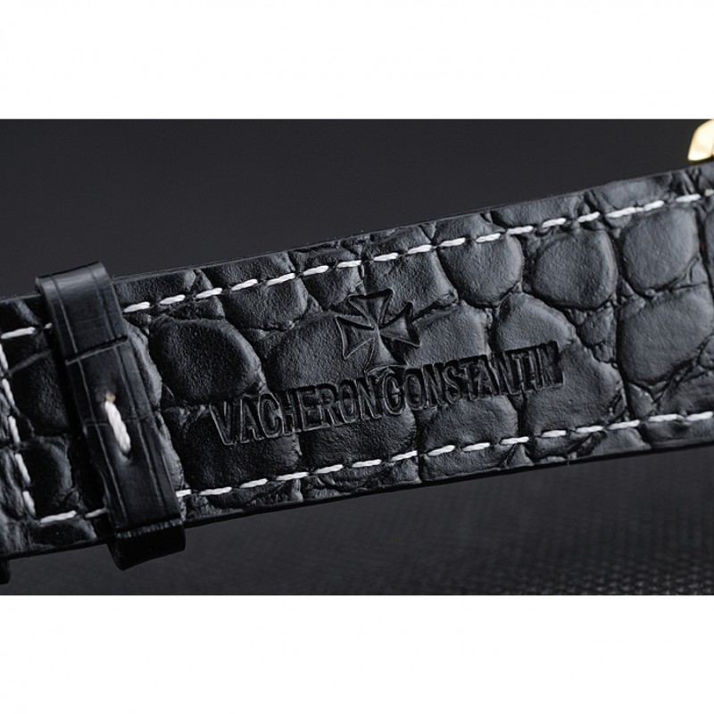 Bracelet:Vacheron Constantin et la chaleur de logo en relief crocodile noir bracelet en cuir avec des coutures de fil blanc et Vacheron Constantin logo sculpté 18k crochet plaqué or jaune fermoir -buckle