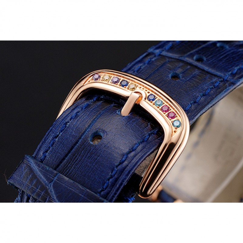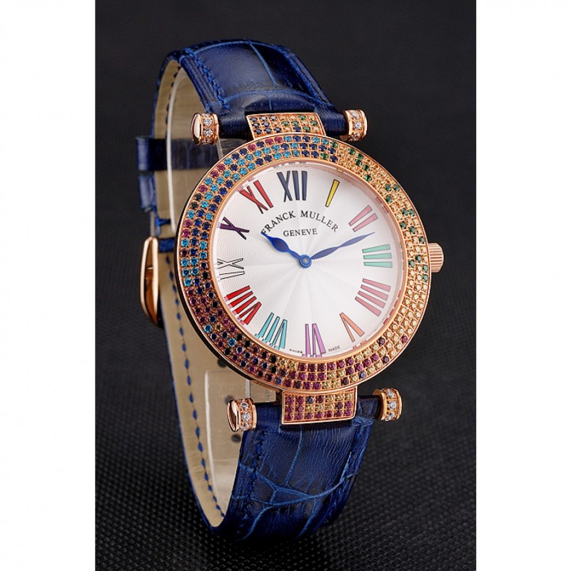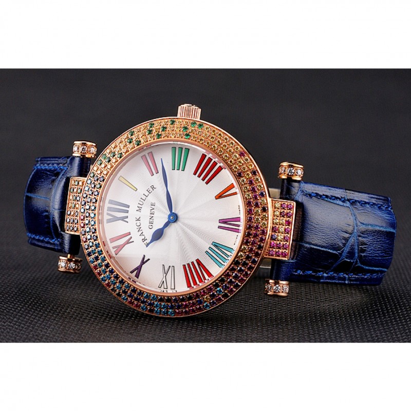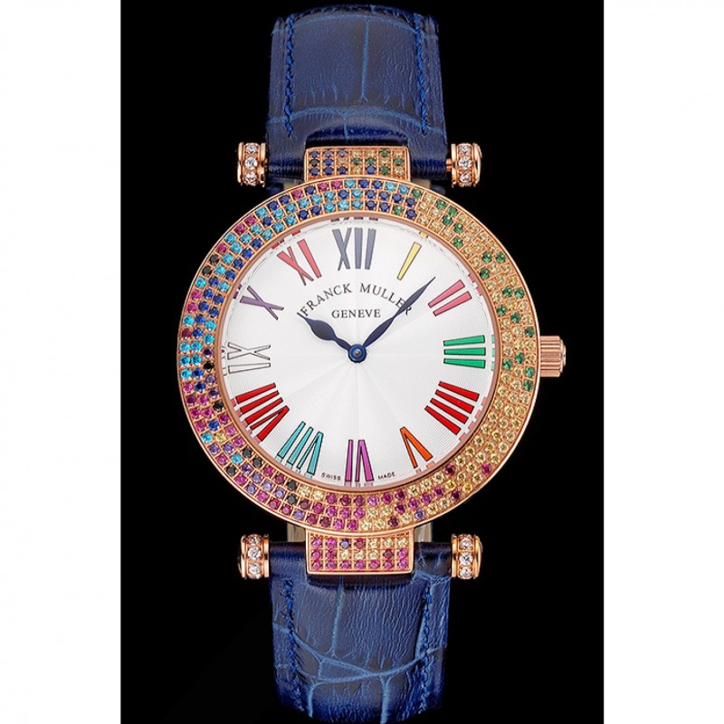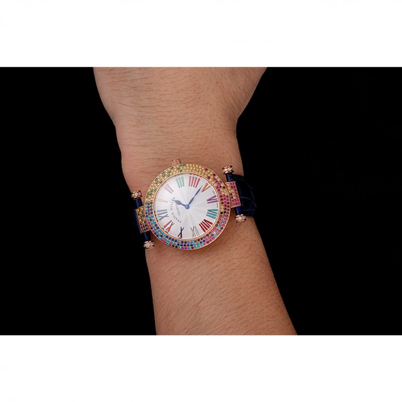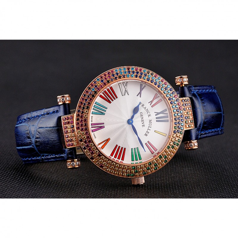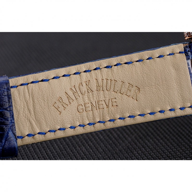 Bracelet:Franck Muller Geneve chaleur bracelet en cuir de crocodile bleu gravé 18k incrustée de cristal multicolore rose plaqué or fermoir crochet-boucle