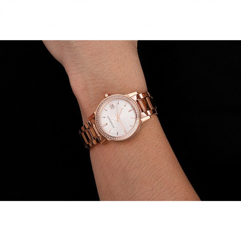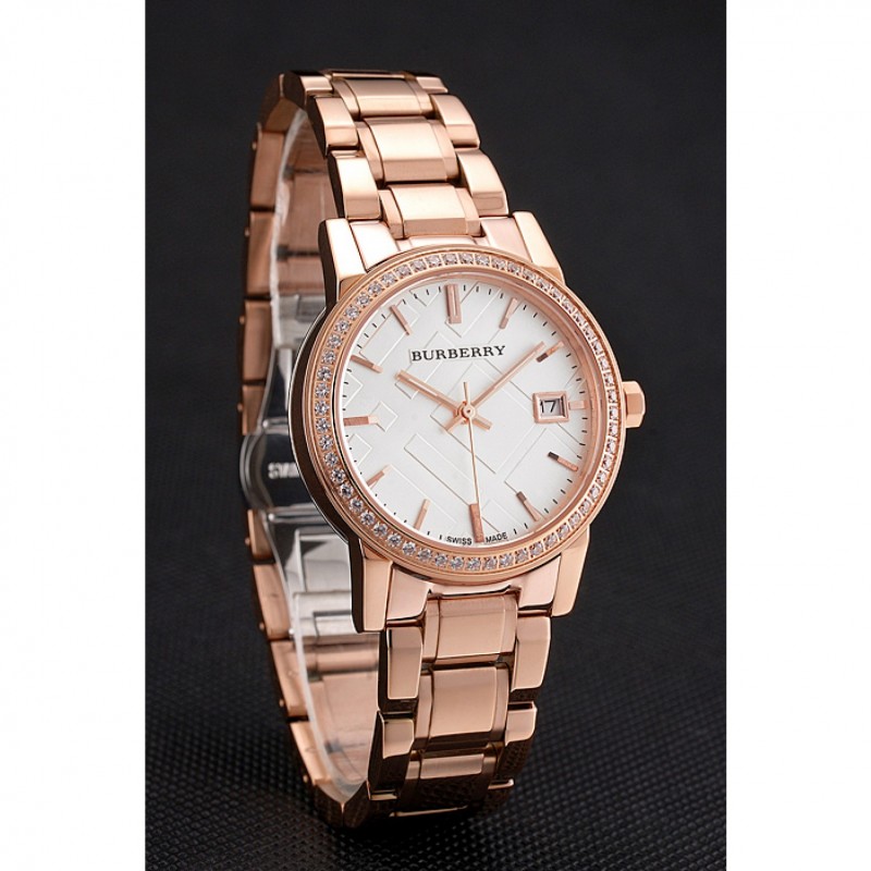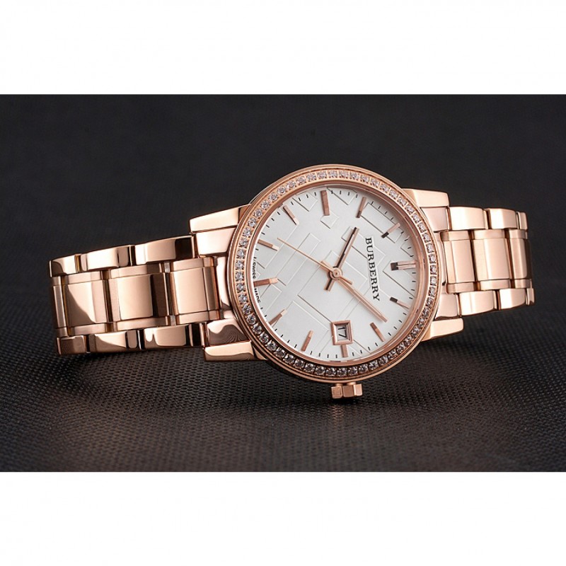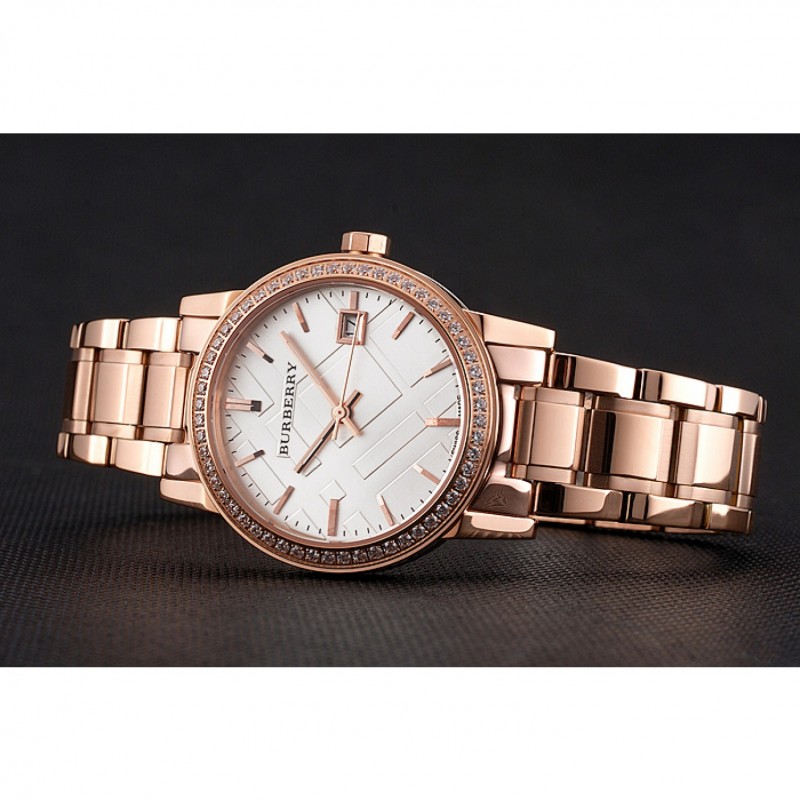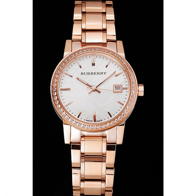 Haut Gamme Replique Montre Burberry La ville blanche Dial lunette sertie de diamants boîtier en or rose et bracelet