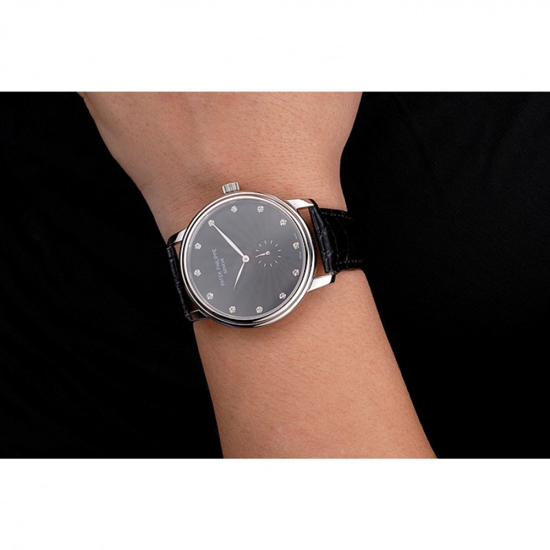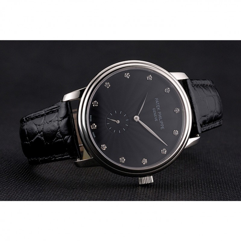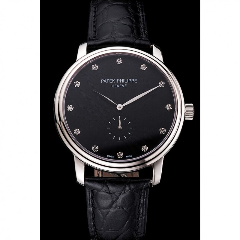 Haute qualité Replique Montre Patek Philippe Calatrava cadran noir Boîtier en acier inoxydable Bracelet en cuir noir