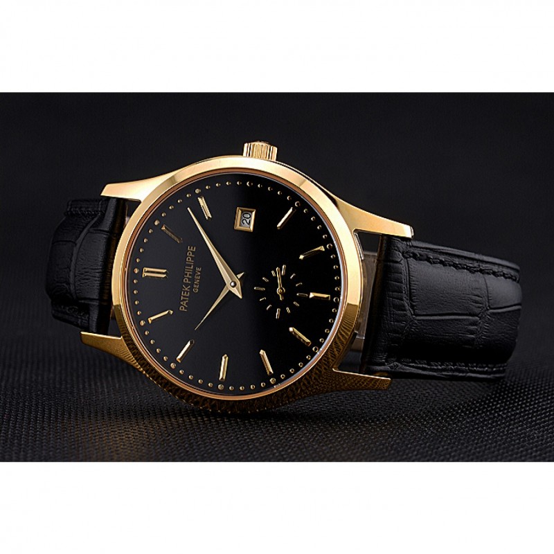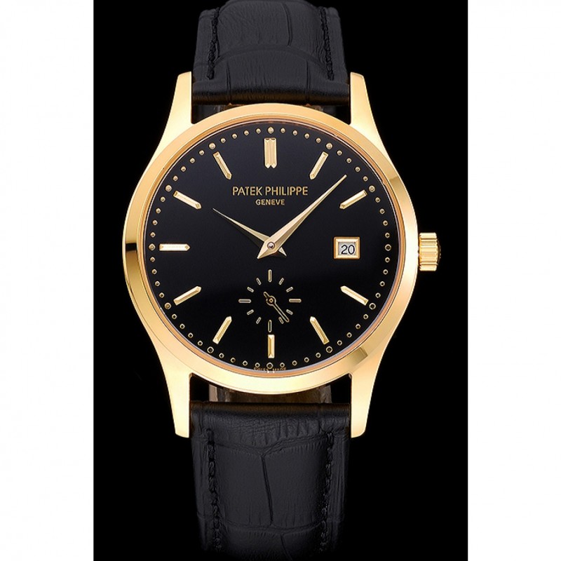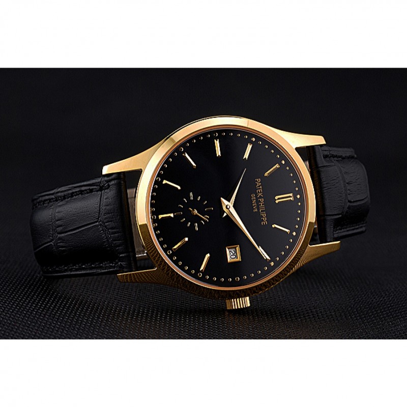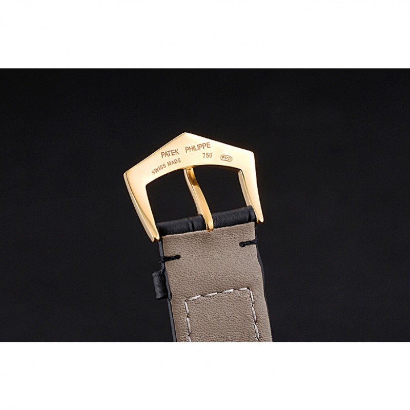 Bracelet:Patek Philippe Geneve et logo chaleur bracelet en cuir de crocodile noir en relief avec 18k plaqué or jaune fermoir crochet boucle