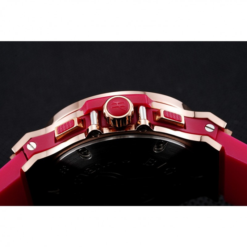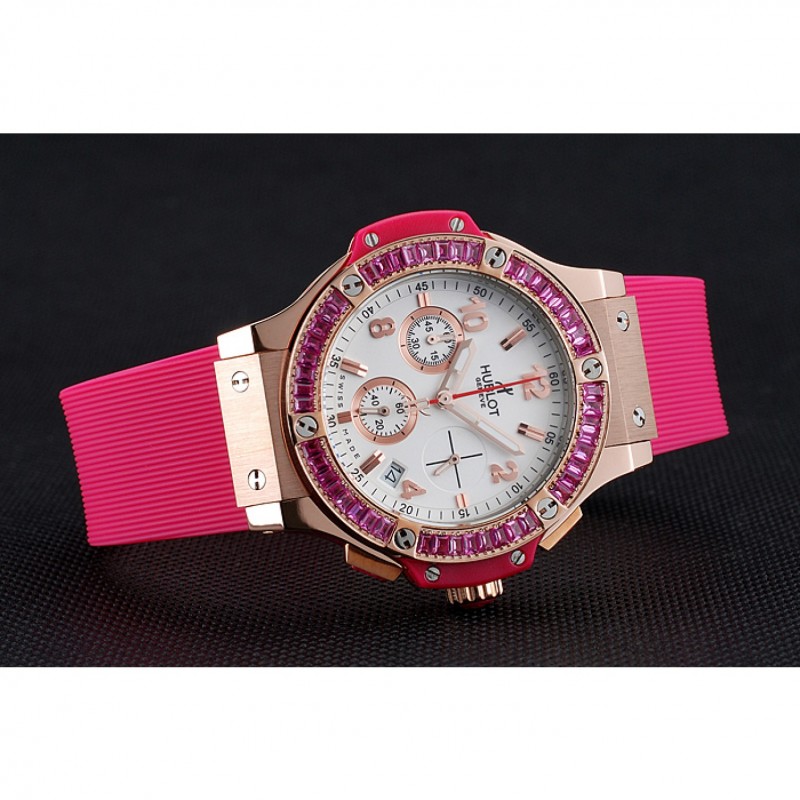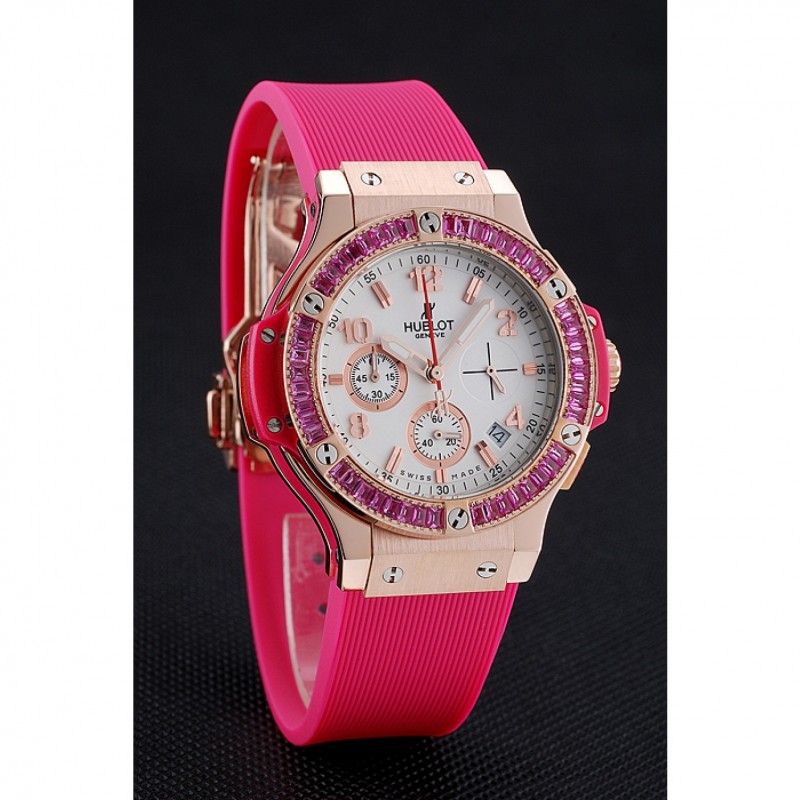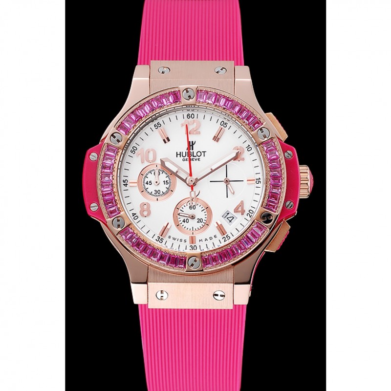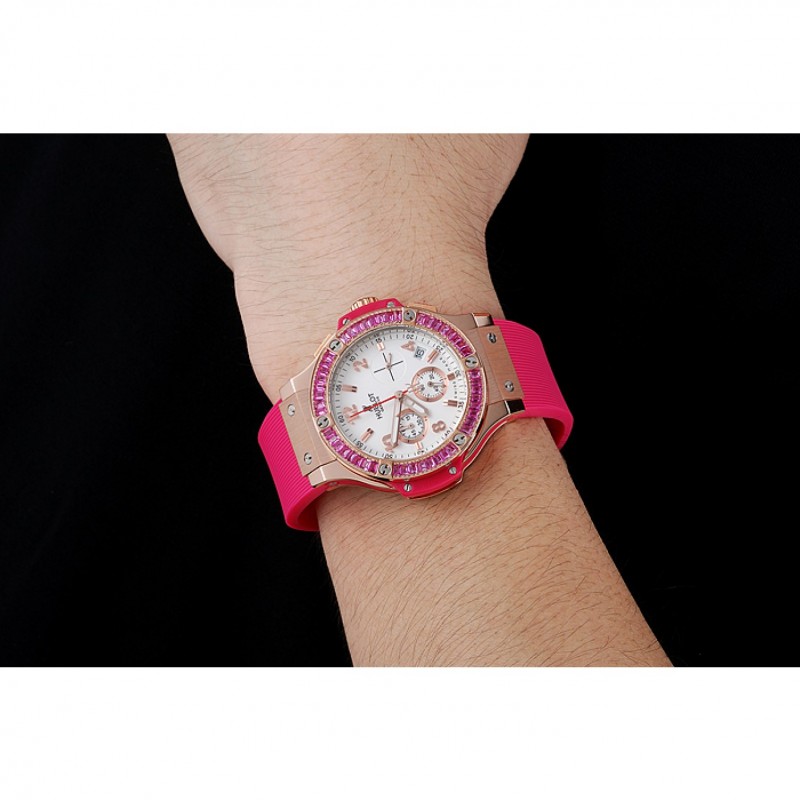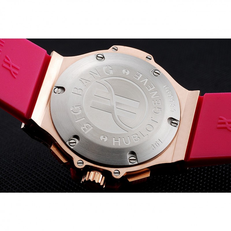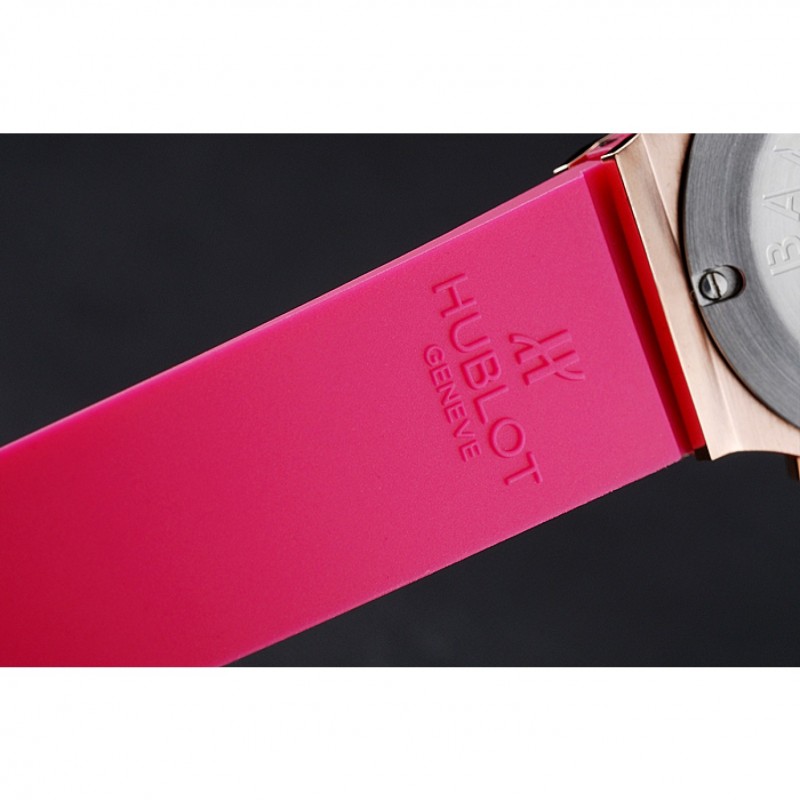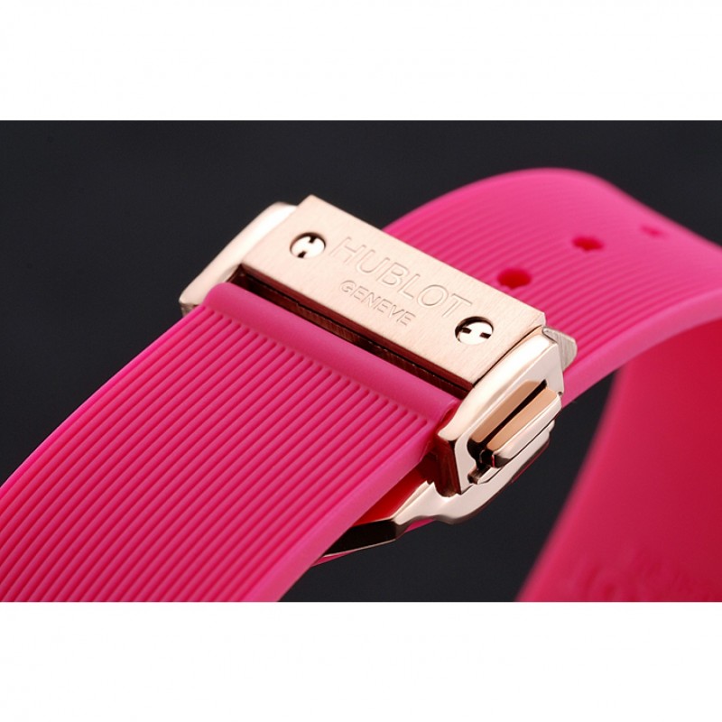 Bracelet:Texture bande de caoutchouc rose avec fermoir à crochet à bouton-poussoir rose-or et des gravures Hublot