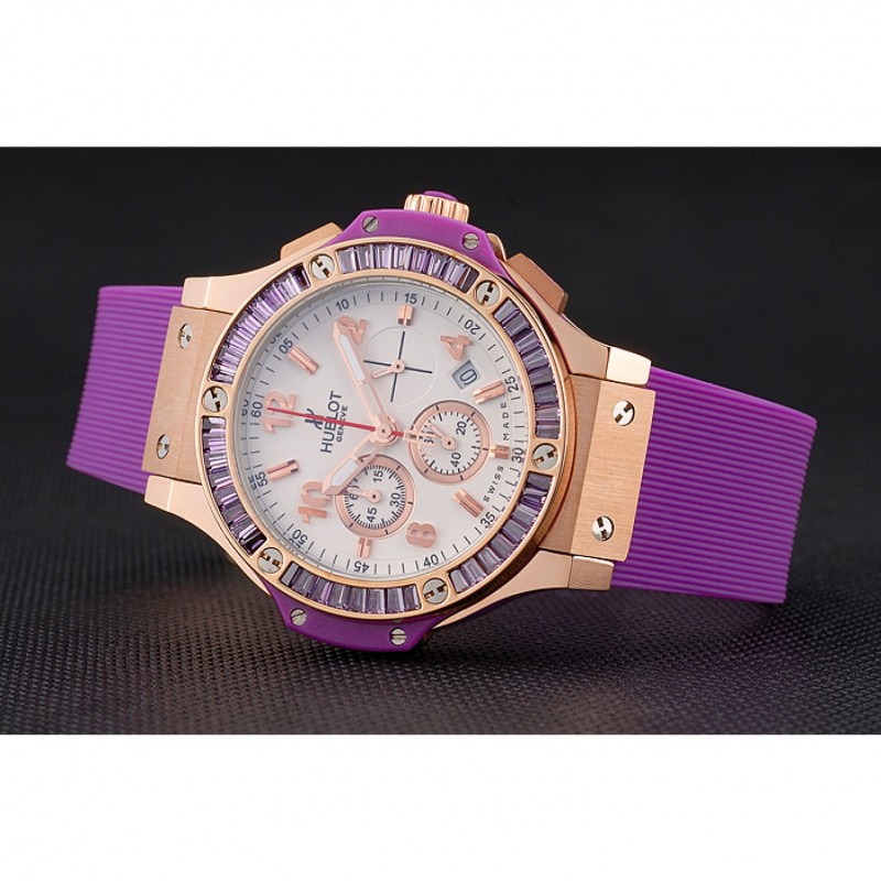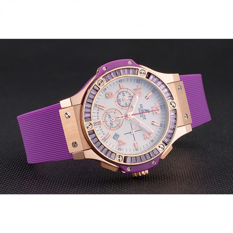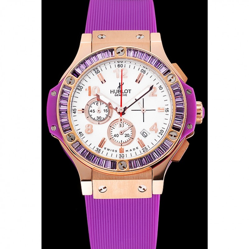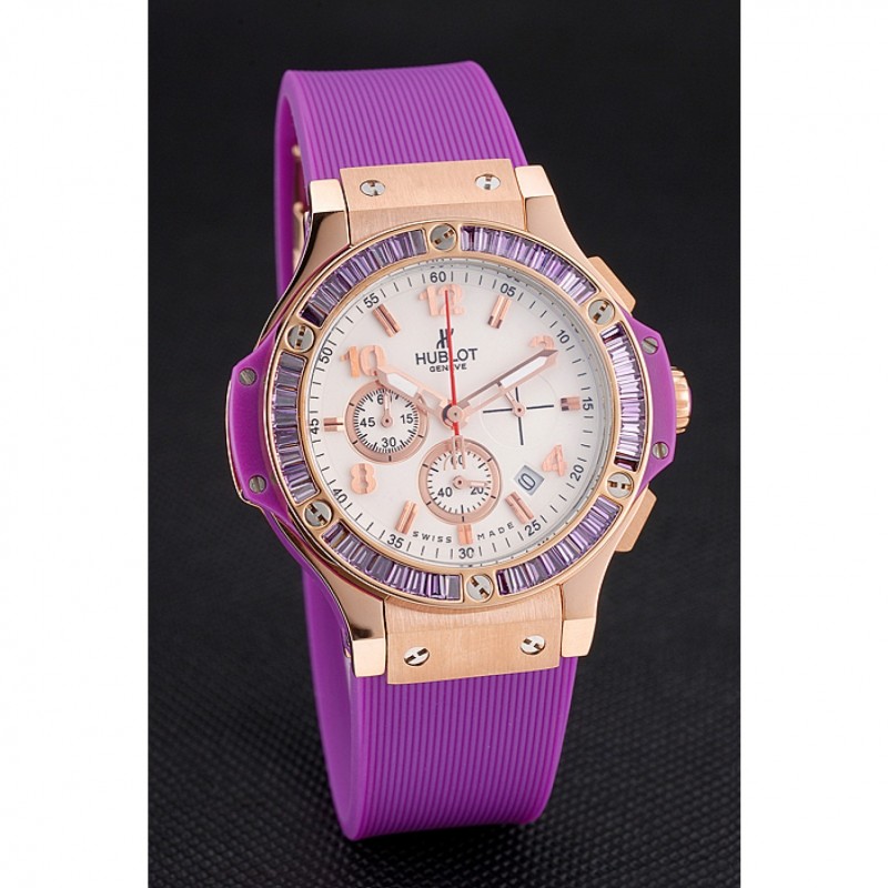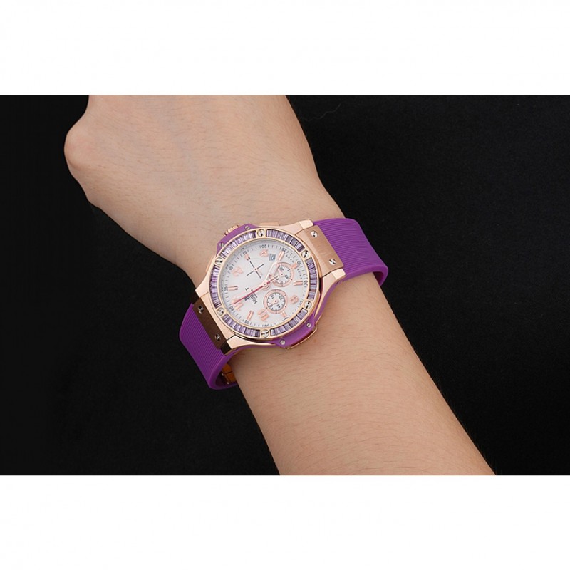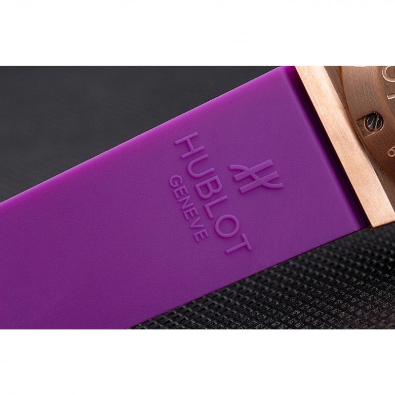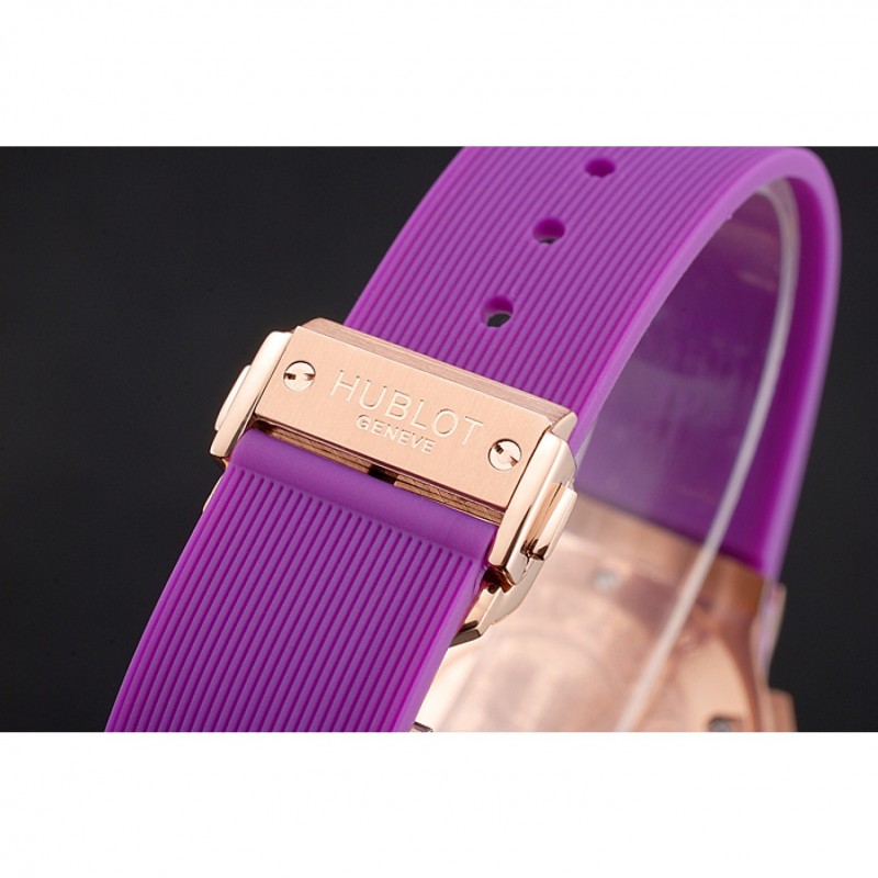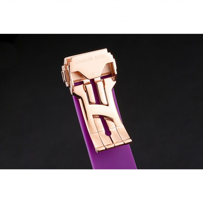 Bracelet:Texture bande de caoutchouc violet avec fermoir à crochet à bouton-poussoir rose-or et des gravures Hublot