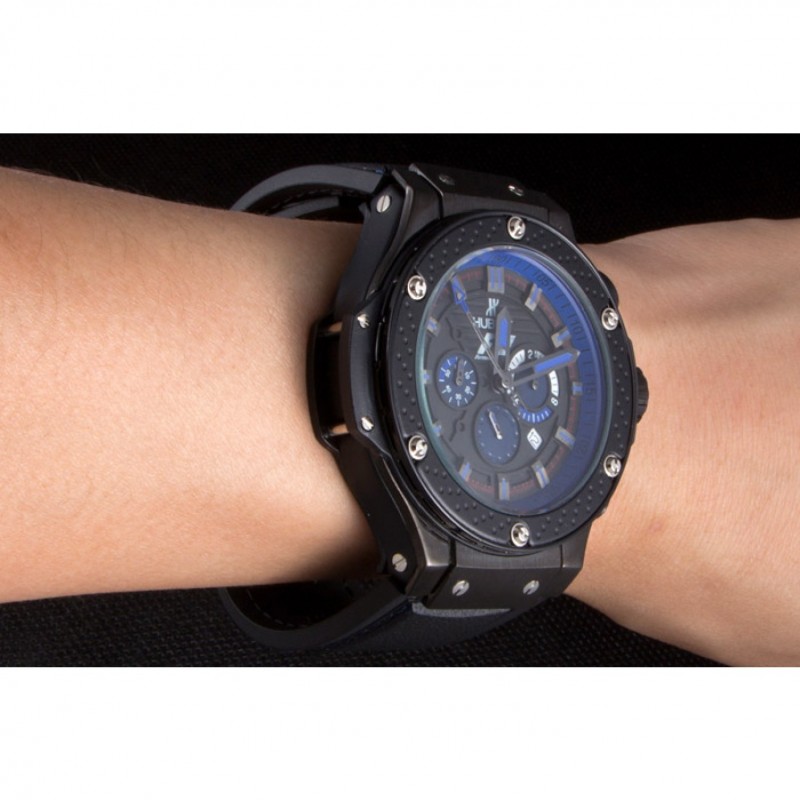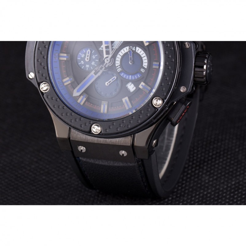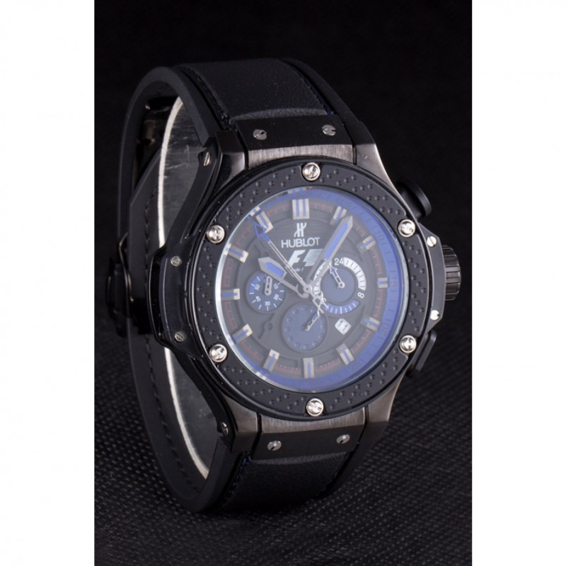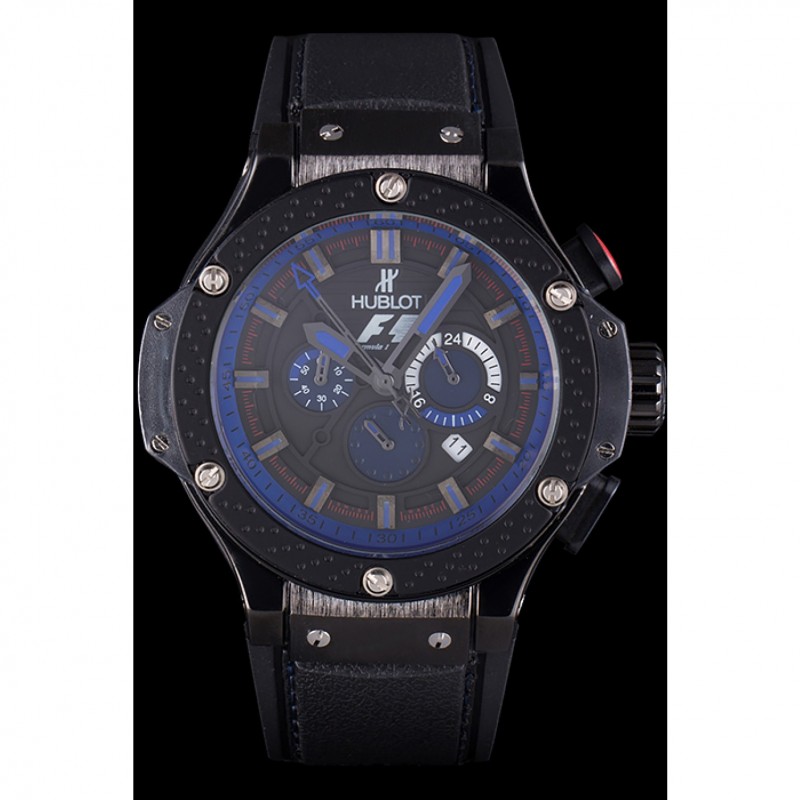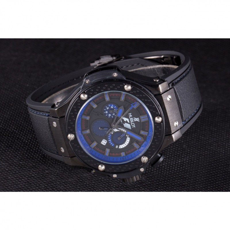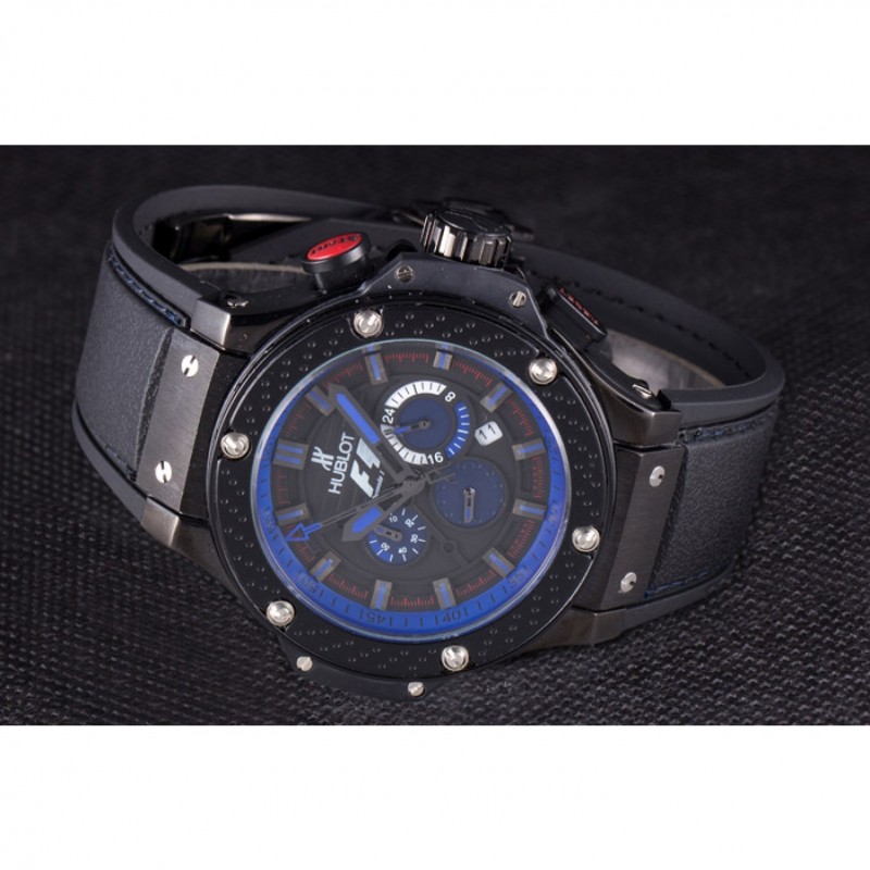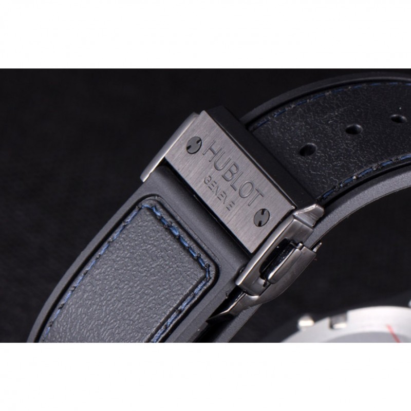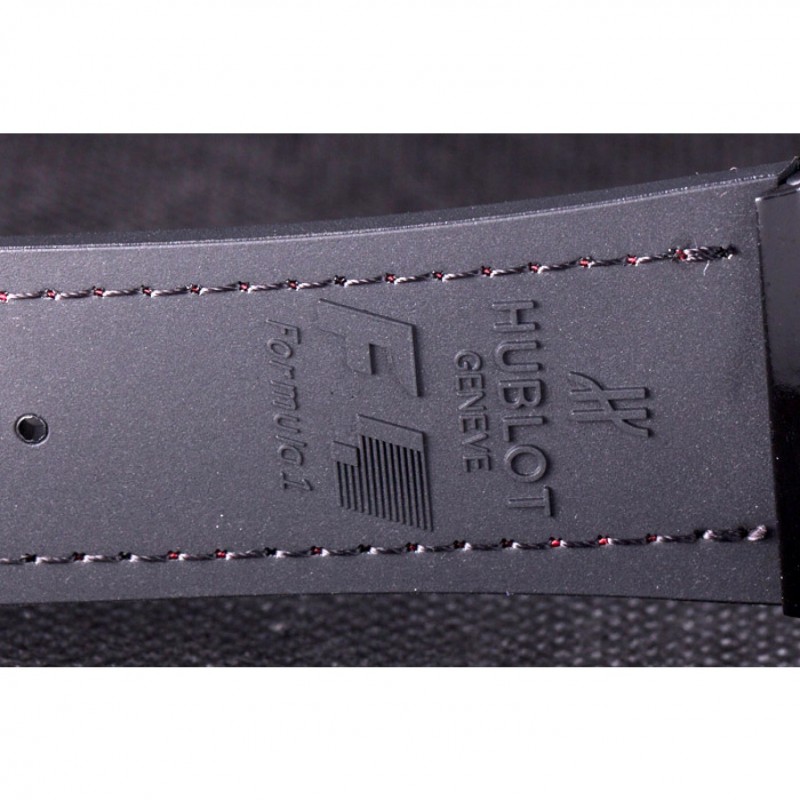 Bracelet :Hublot Geneve F1 chaleur en relief bracelet en caoutchouc noir texturé avec coutures fil bleu et Hublot Geneve gravée push-libération fermoir à crochet placage ionique