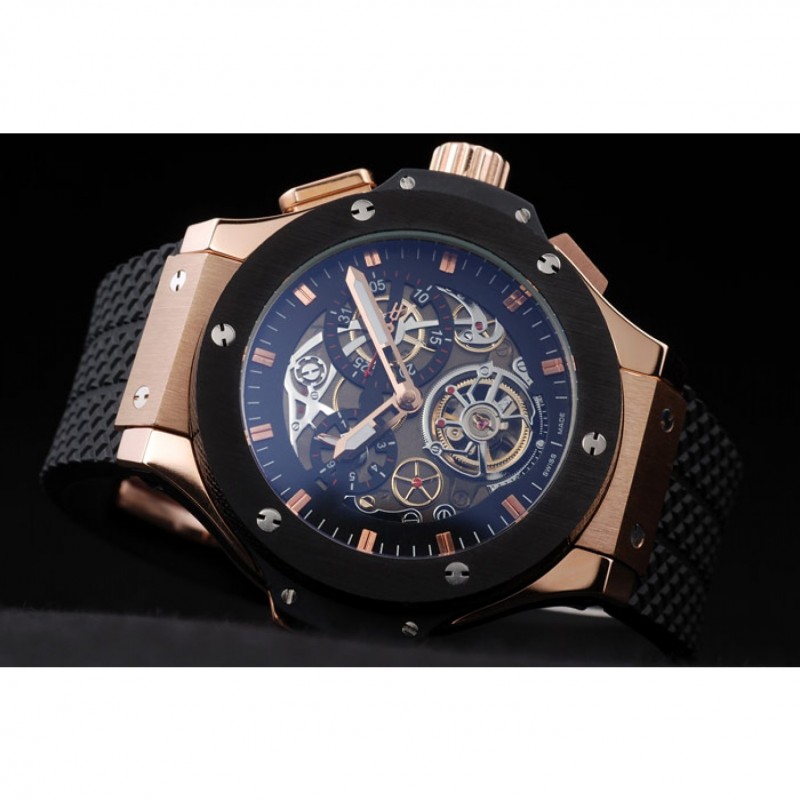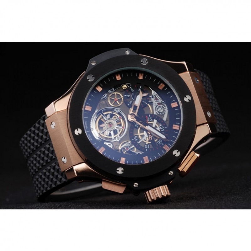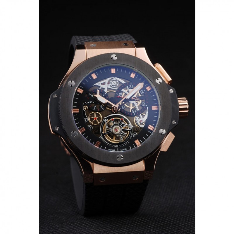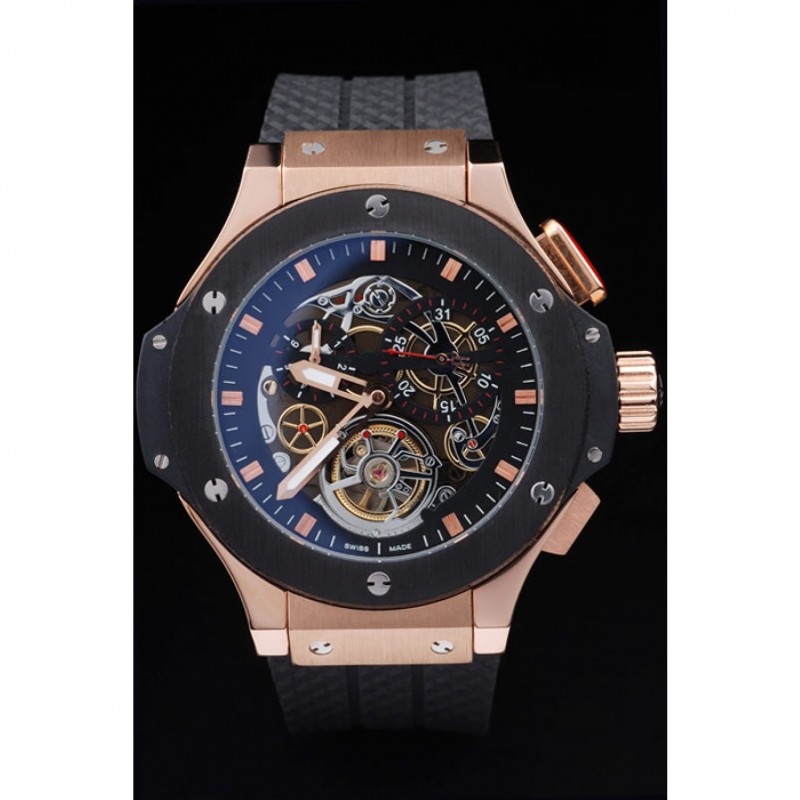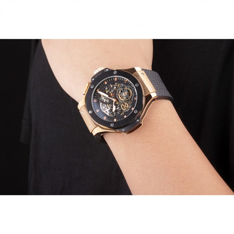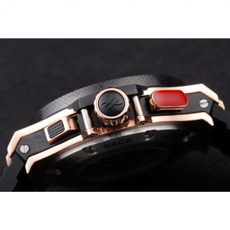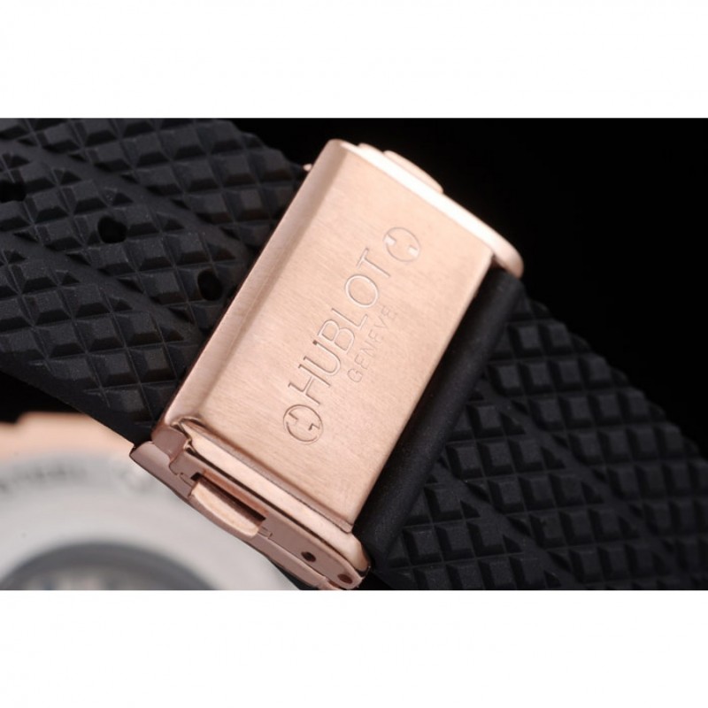 Bracelet:Texture bande de caoutchouc noir avec fermoir à crochet à bouton-poussoir rose-or et des gravures Hublot