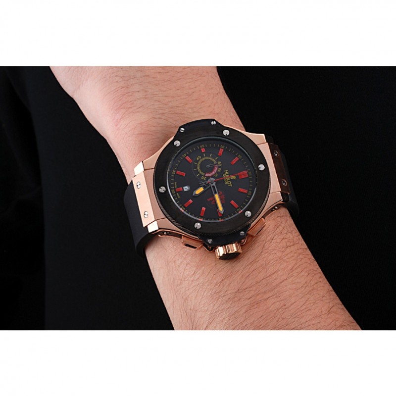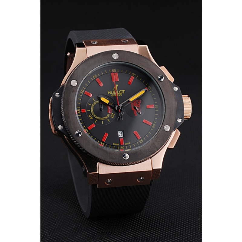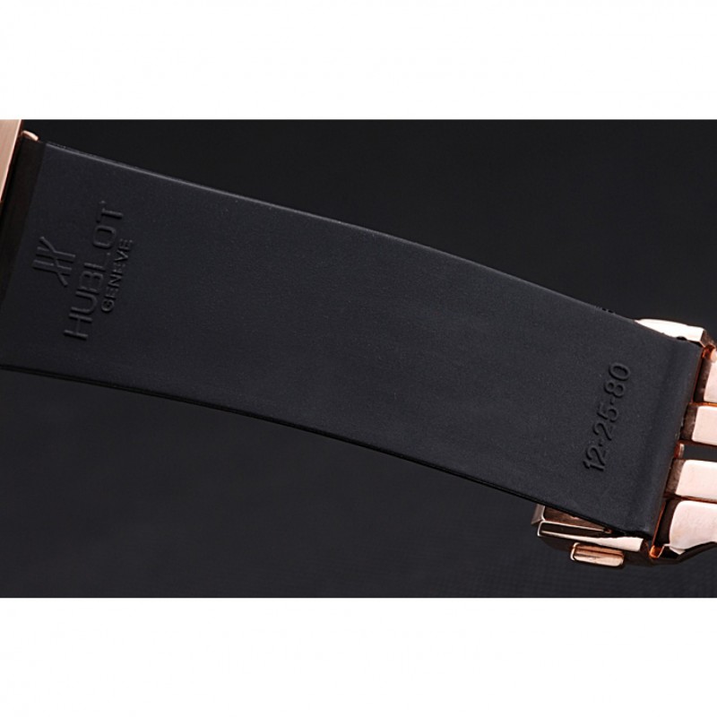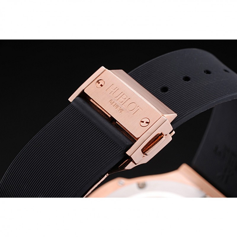 Bracelet:Heat logo en relief et Hublot Geneve nervurées bracelet en caoutchouc noir avec Hublot Geneve gravé fold over or rose plaqué pousser à libération fermoir à crochet