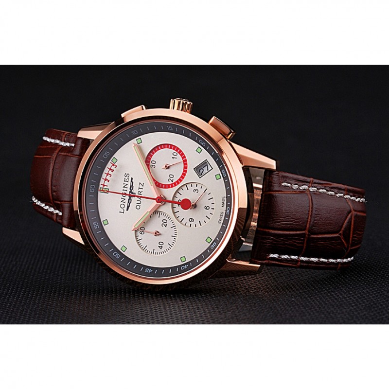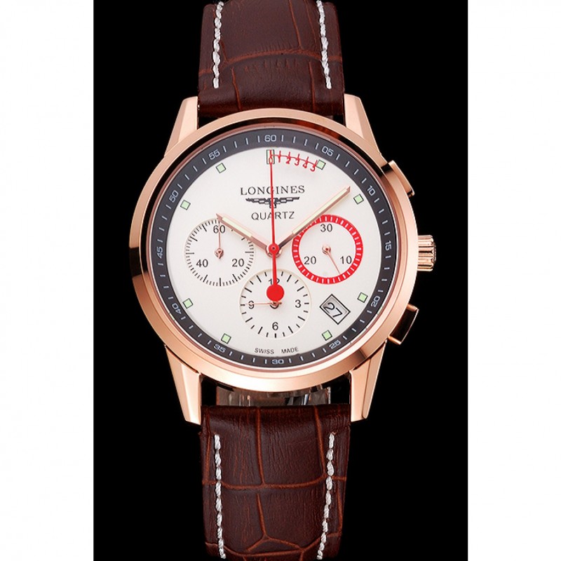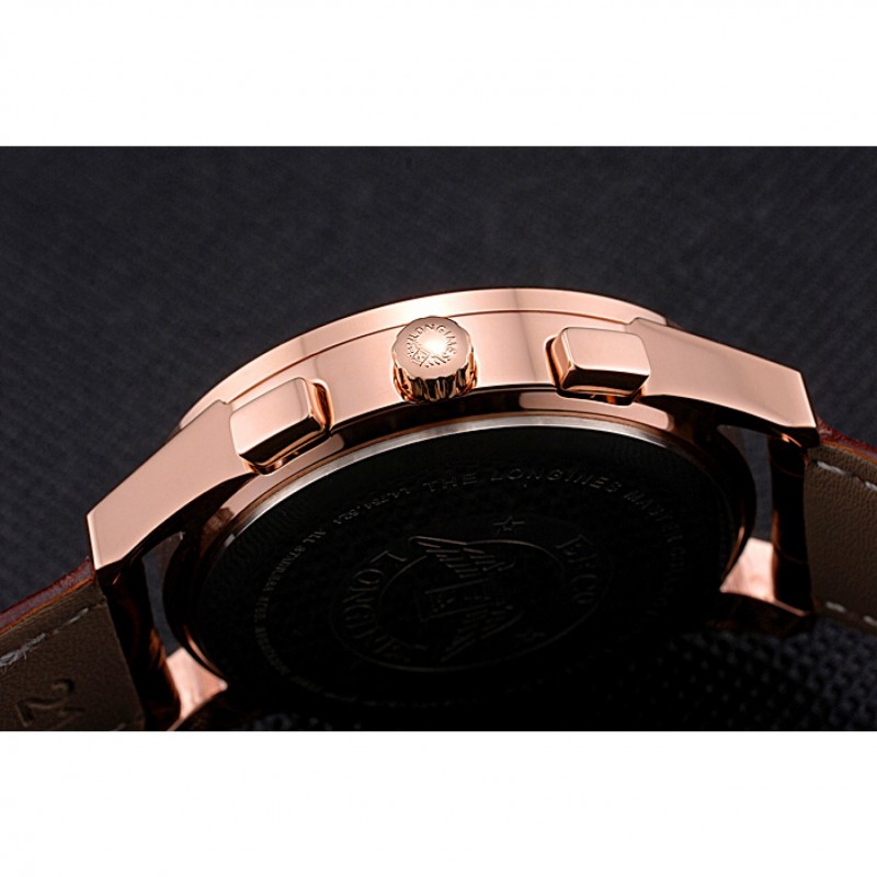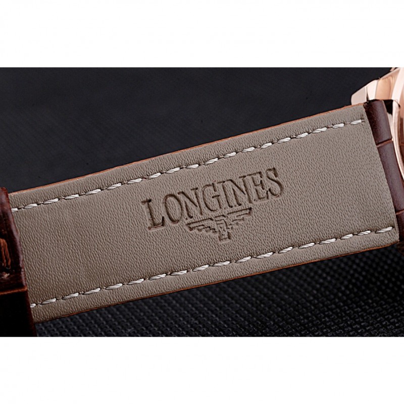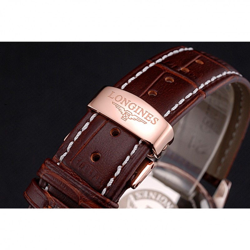 Bracelet:logo et de la chaleur Longines bracelet en cuir de crocodile brun gaufré avec des coutures de fil blanc et logo et Longines 18k gravé en or rose plaqué fermoir à boucle