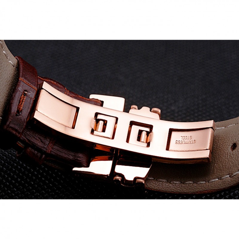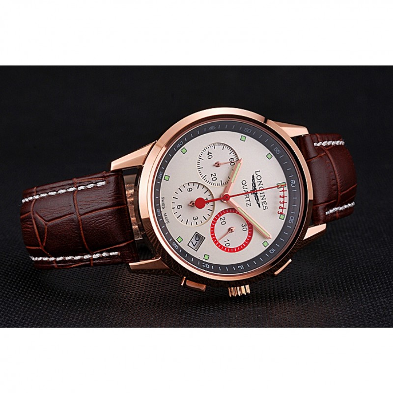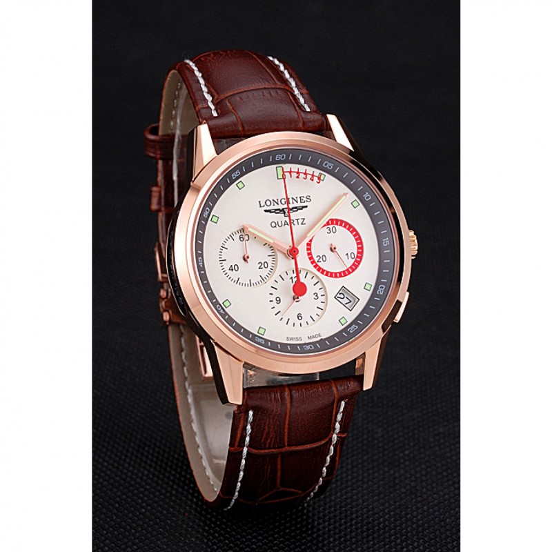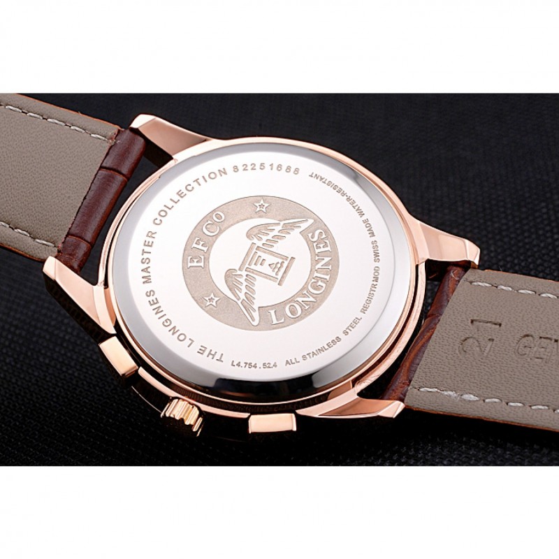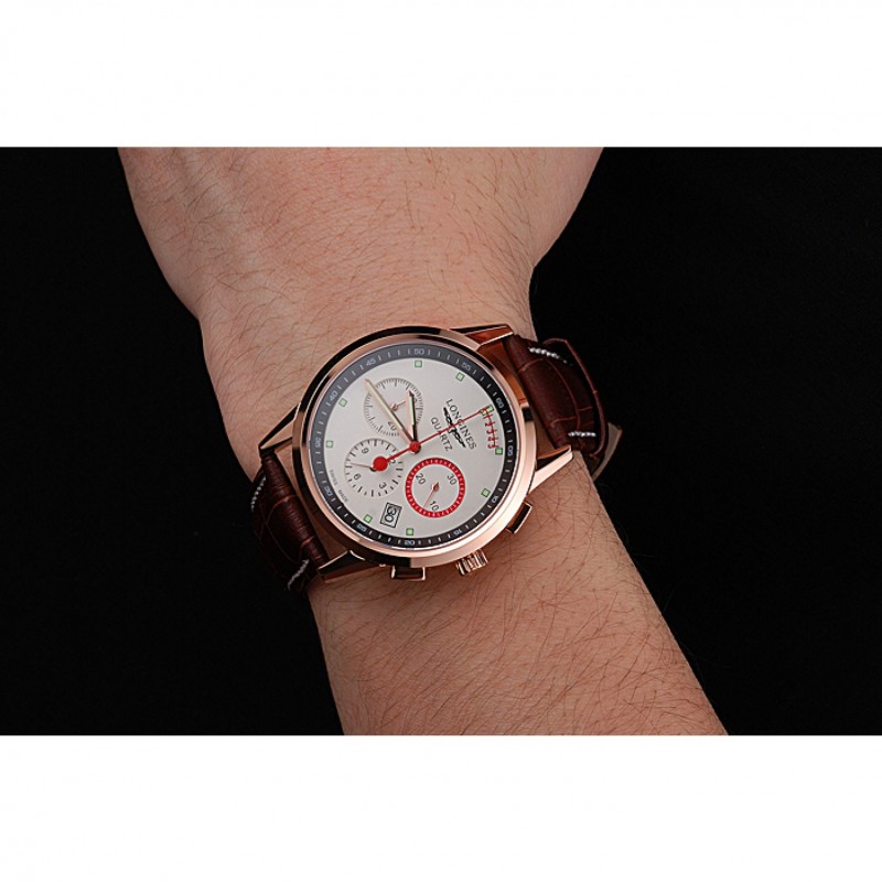 Bracelet:logo et de la chaleur Longines bracelet en cuir de crocodile brun gaufré avec des coutures de fil blanc et logo et Longines 18k gravé en or rose plaqué fermoir à boucle