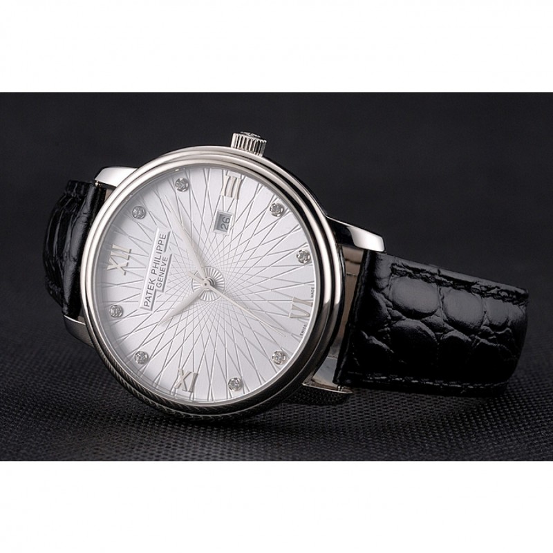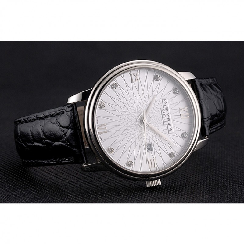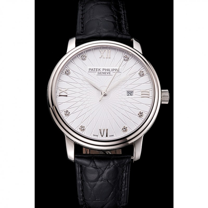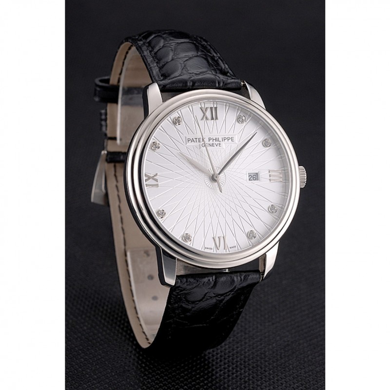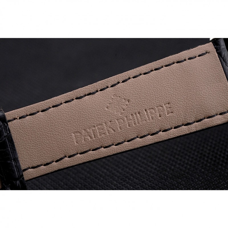 Bracelet:Patek Philippe et chaleur estampillage noir bracelet en cuir de crocodile avec Patek Philippe et logo gravé fermoir en acier inoxydable poli crochet boucle