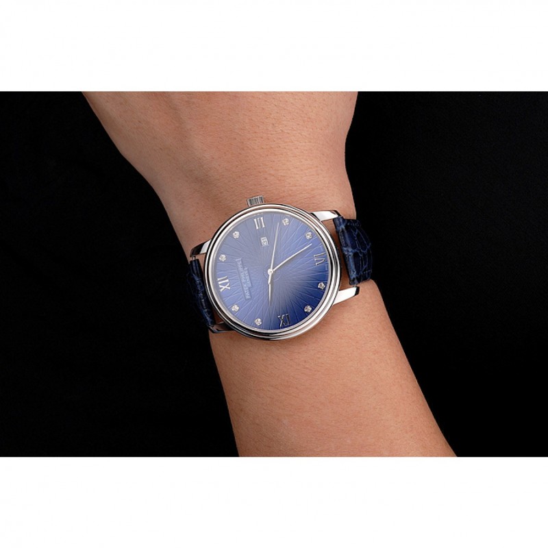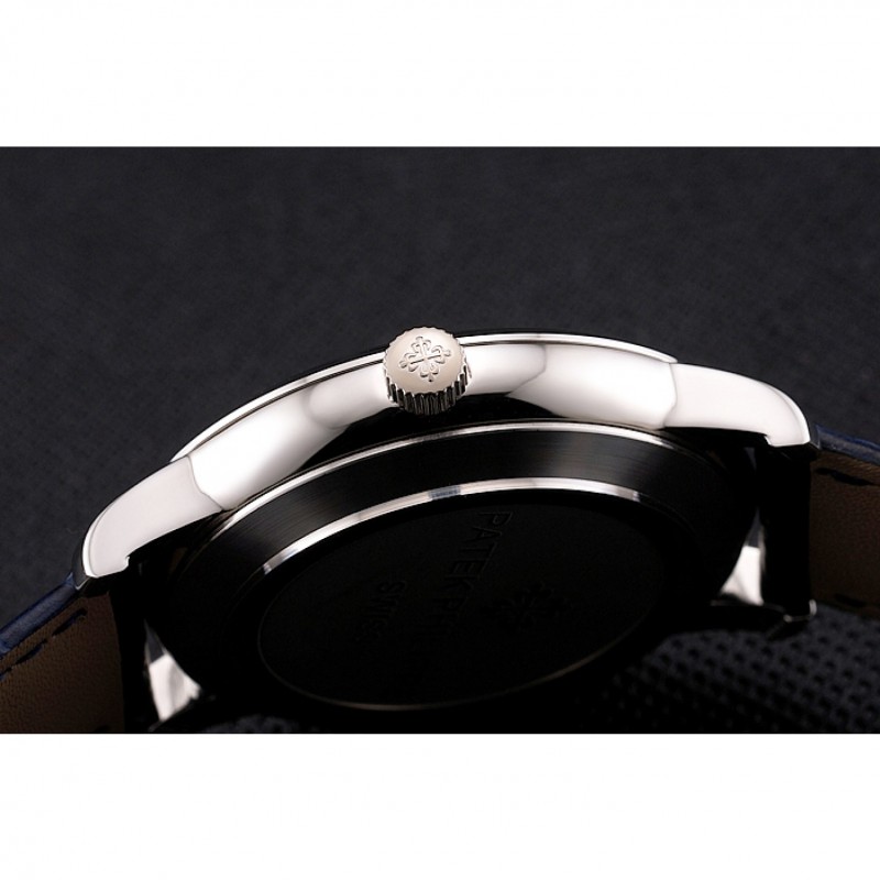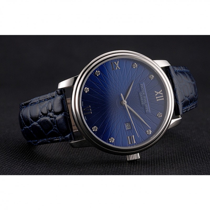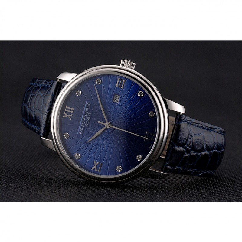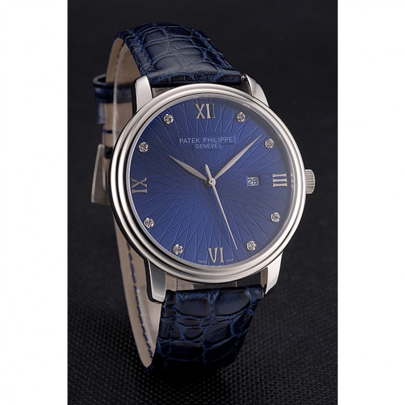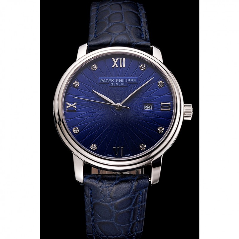 Luxe Replique Montre Patek Philippe Calatrava Date de cadran bleu Boîtier en acier inoxydable Bracelet en cuir bleu