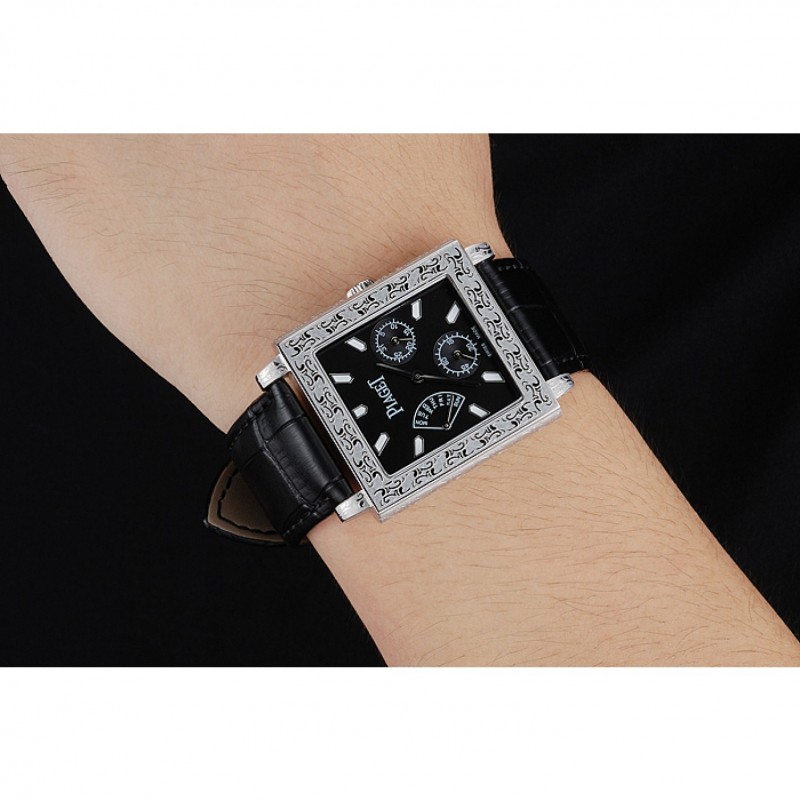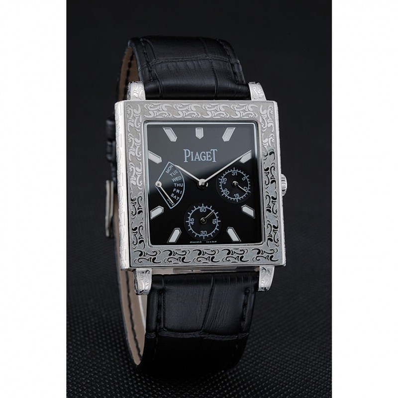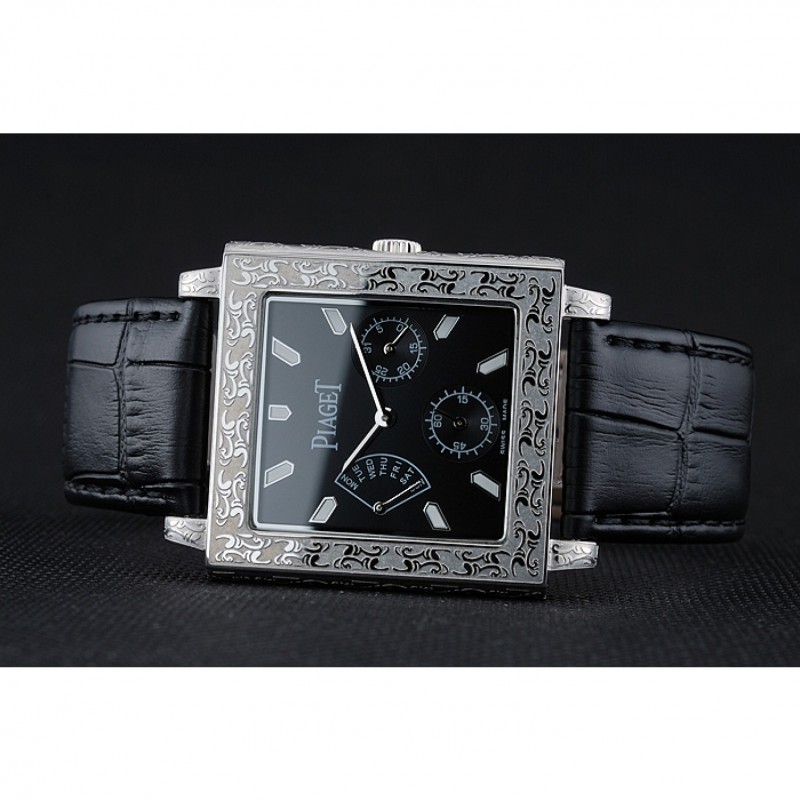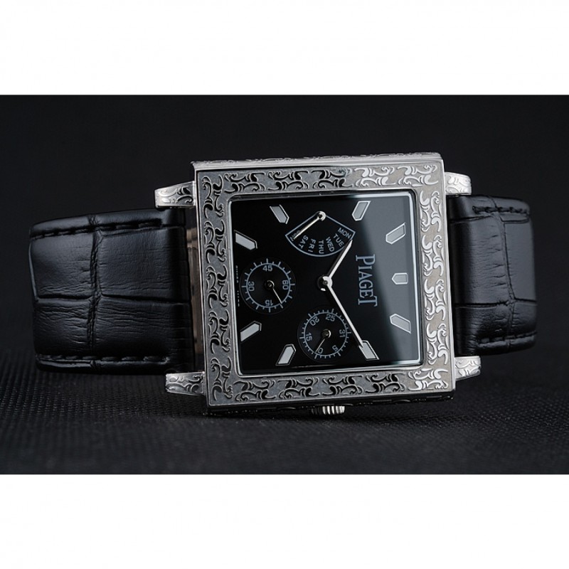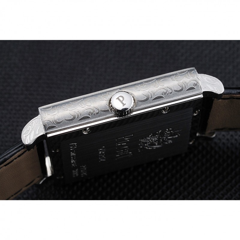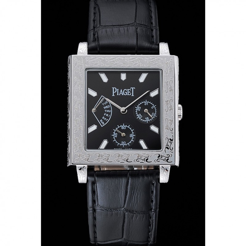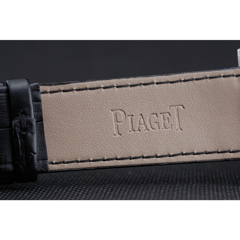 Bracelet:chaleur Piaget gaufré bracelet en cuir crocodile noir avec logo Piaget gravé fermoir crochet-boucle en acier inoxydable poli