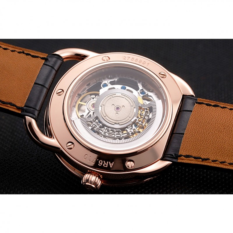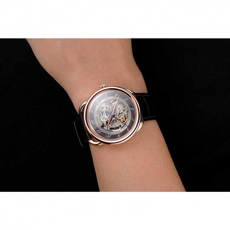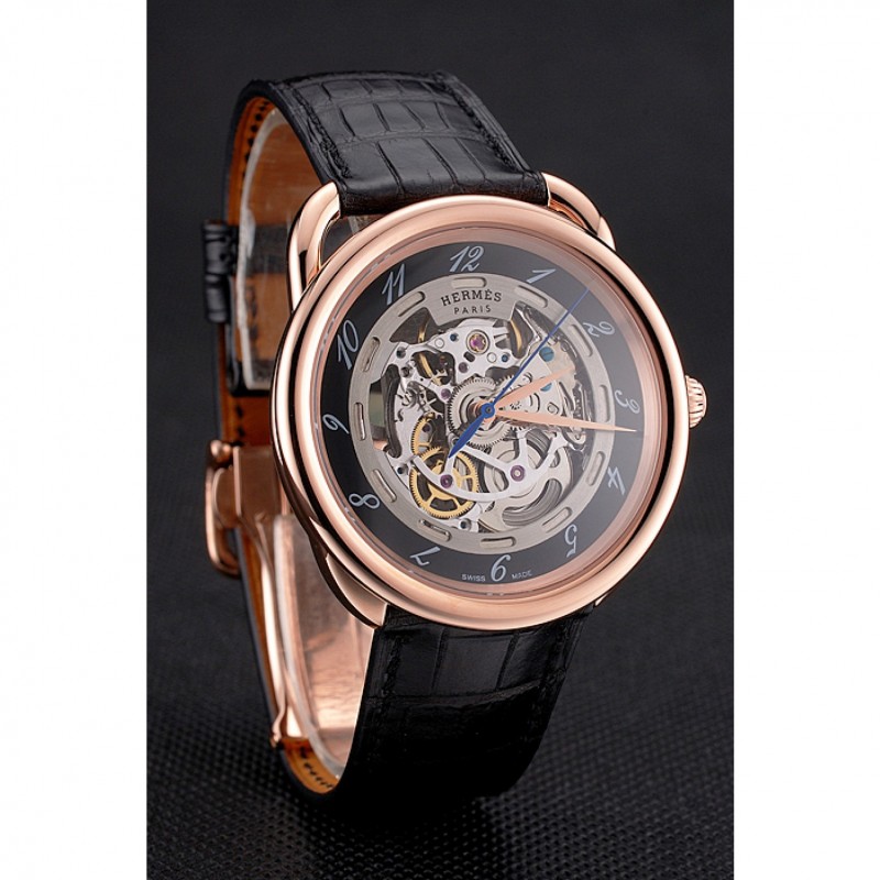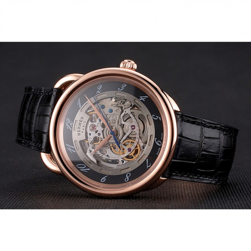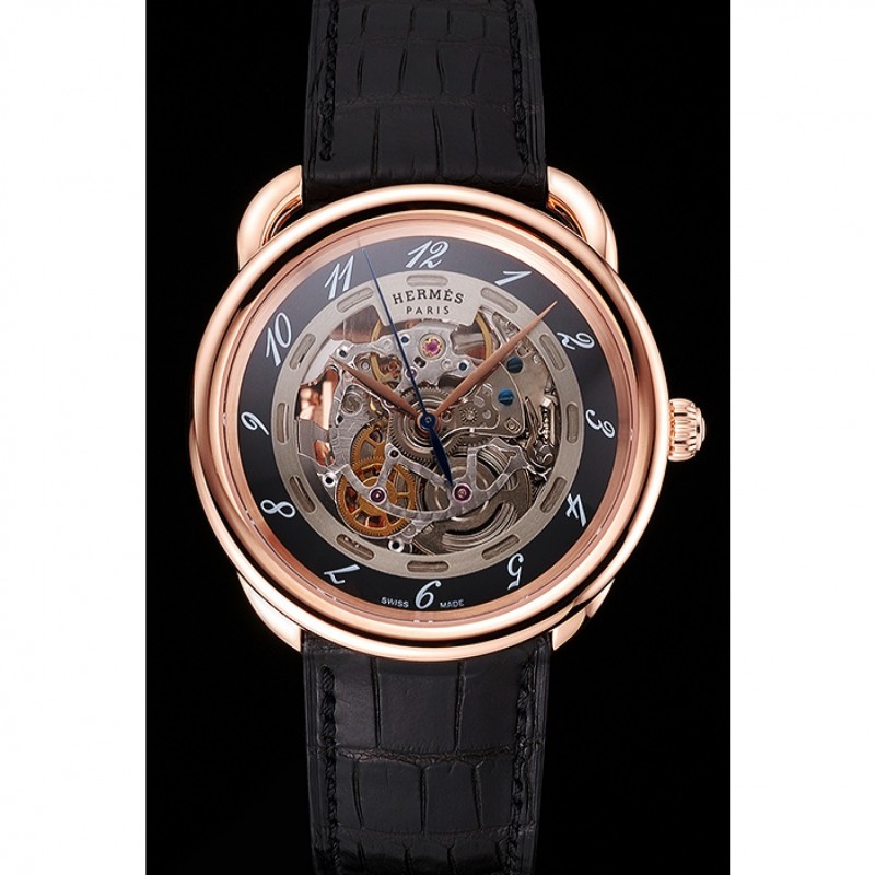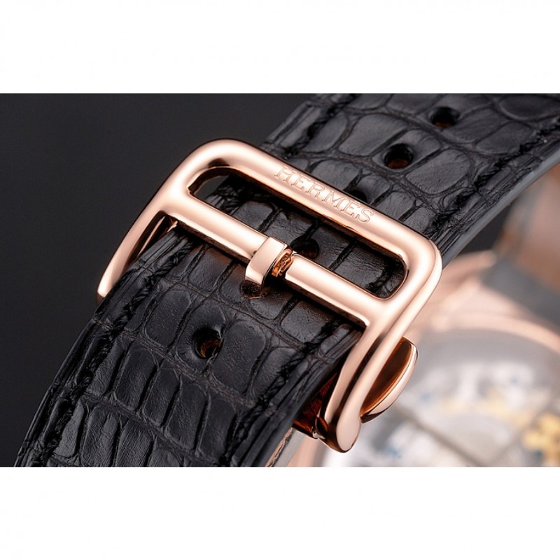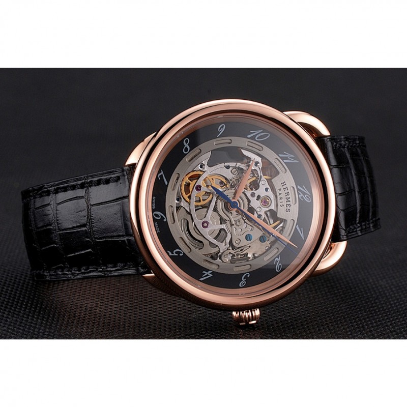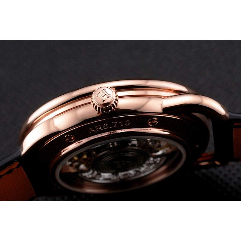 Retourmécanique transparent révélant retour avec 18k or rose plaqué vissé dans la jante et la gravure Hermes