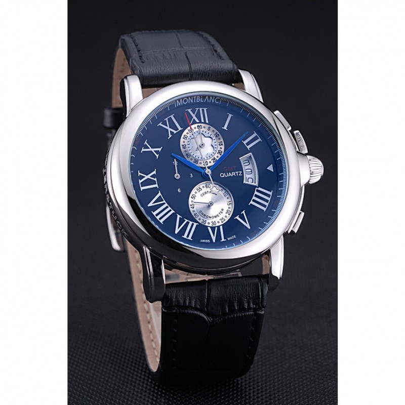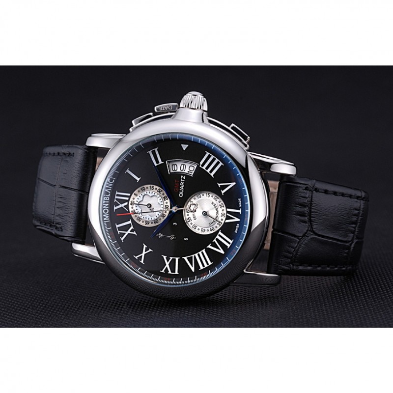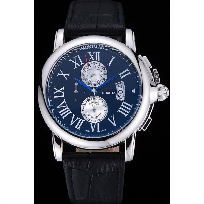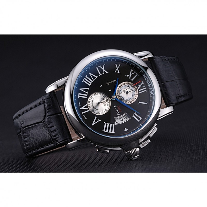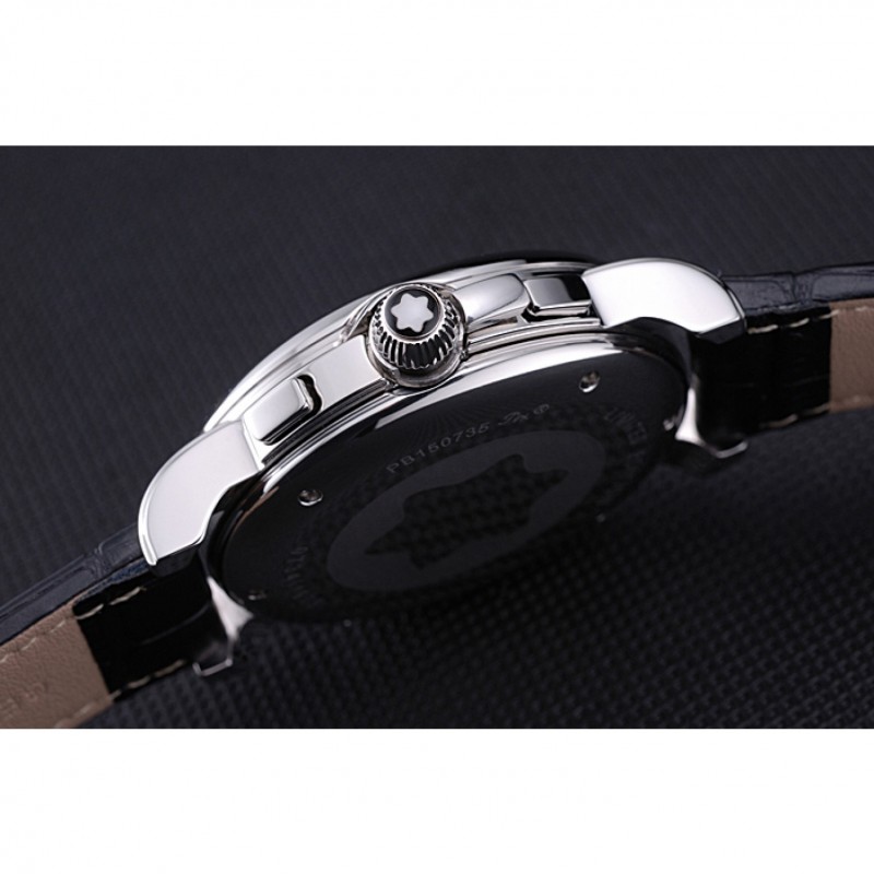 Couronne:couronne en acier inoxydable cutwork poli avec le logo MontBlanc et deux couronnes de bouton-poussoir en acier inoxydable poli son droit et une couronne de bouton-poussoir à sa gauche