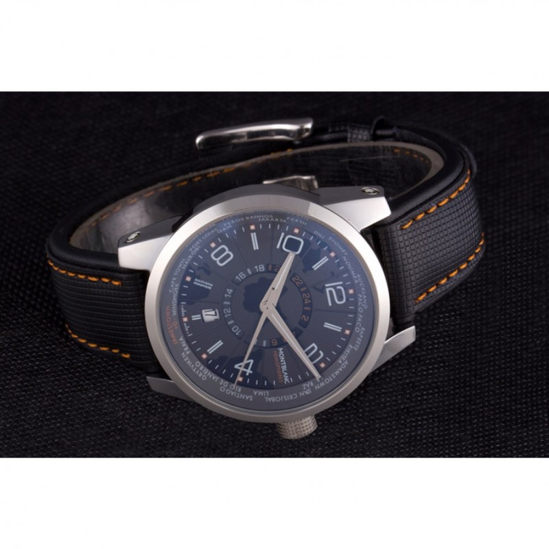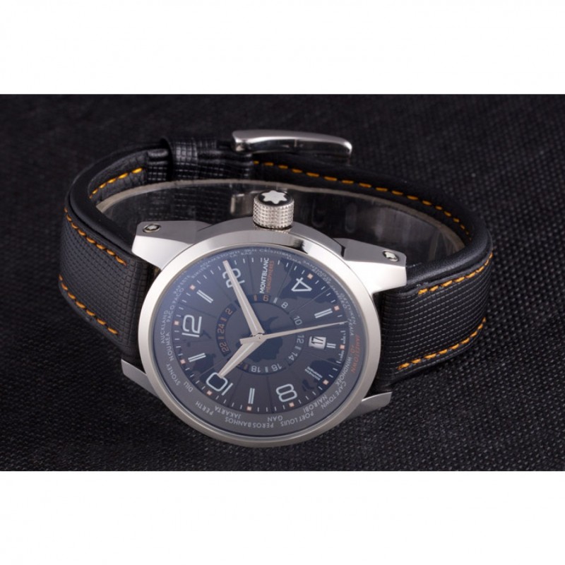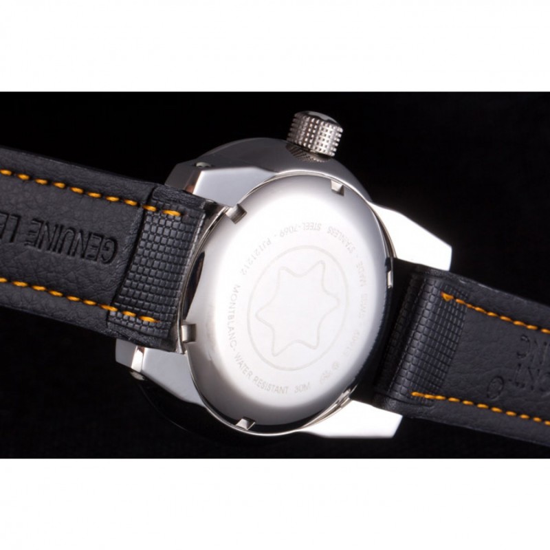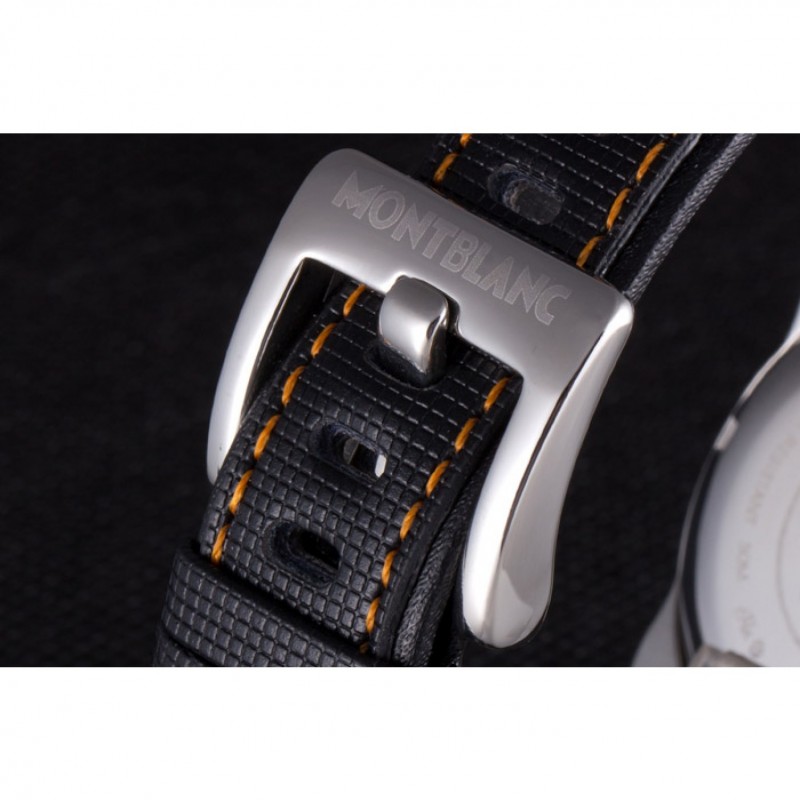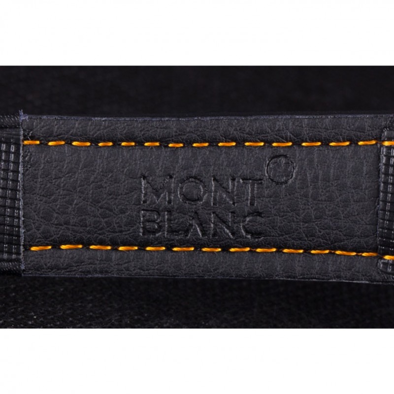 Bracelet:MontBlanc chaleur bracelet en cuir noir texturé en relief avec des coutures de fil orange et MontBlanc inscrit fermoir crochet-boucle en acier inoxydable poli