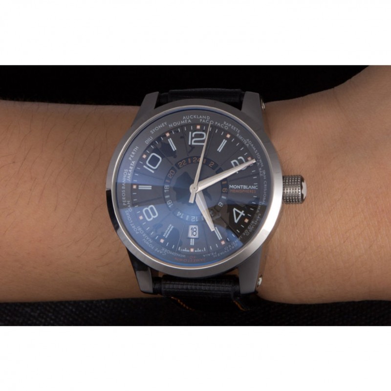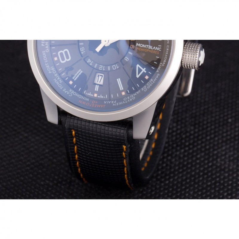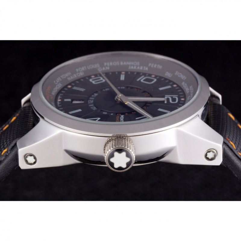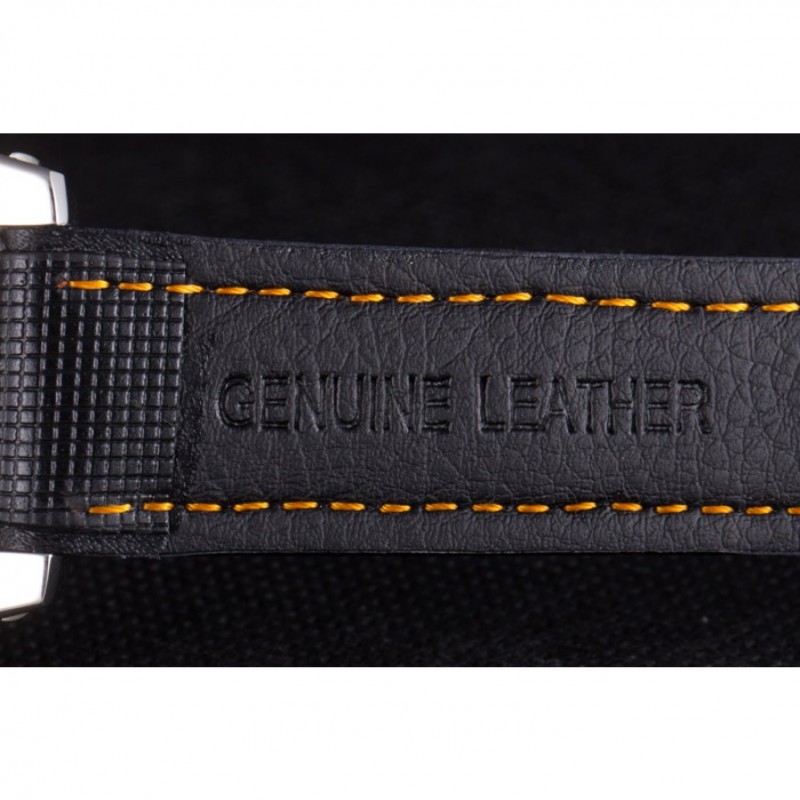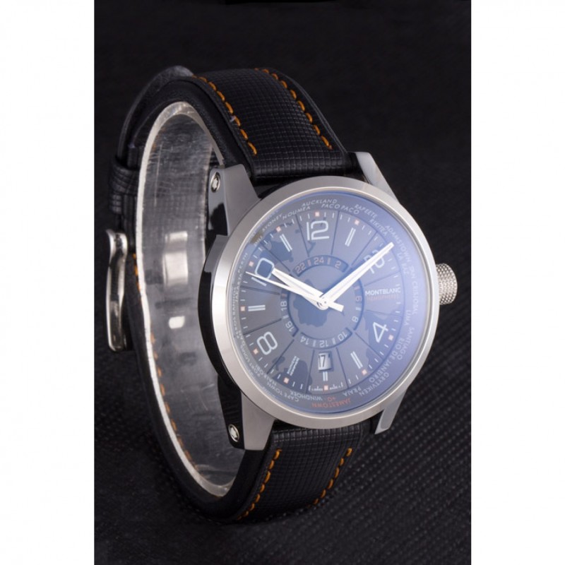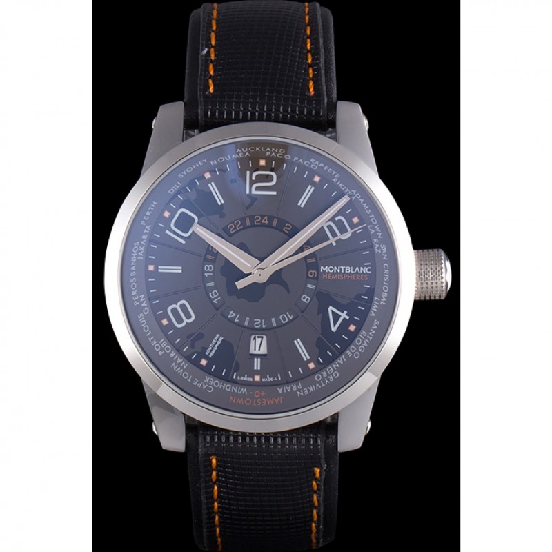 Bracelet:MontBlanc chaleur bracelet en cuir noir texturé en relief avec des coutures de fil orange et MontBlanc inscrit fermoir crochet-boucle en acier inoxydable poli