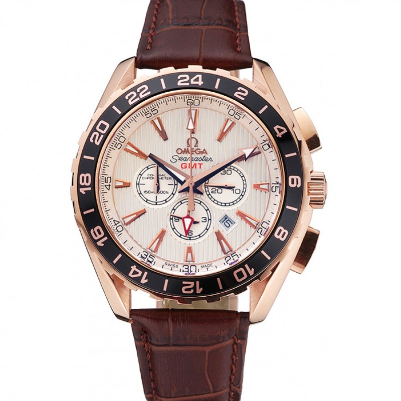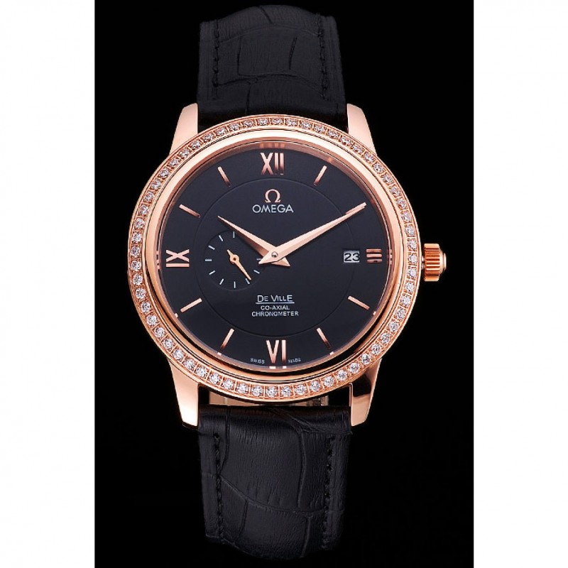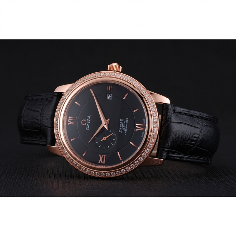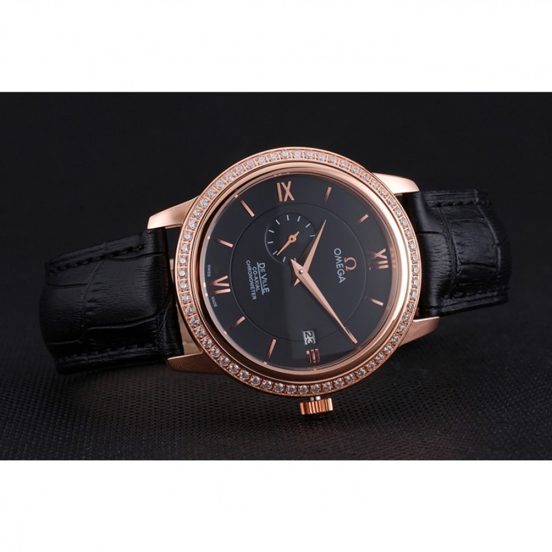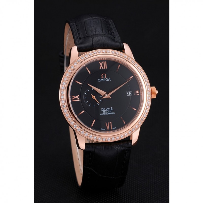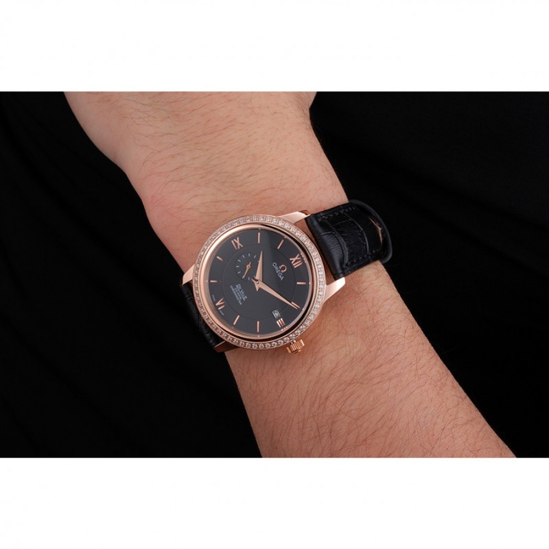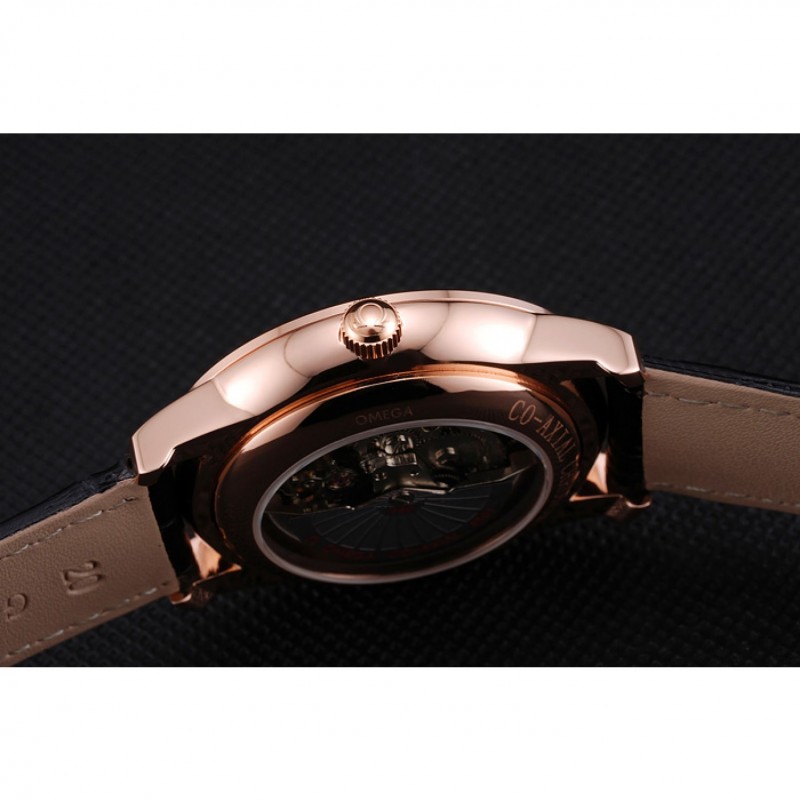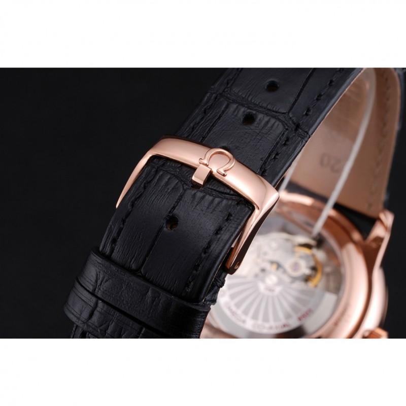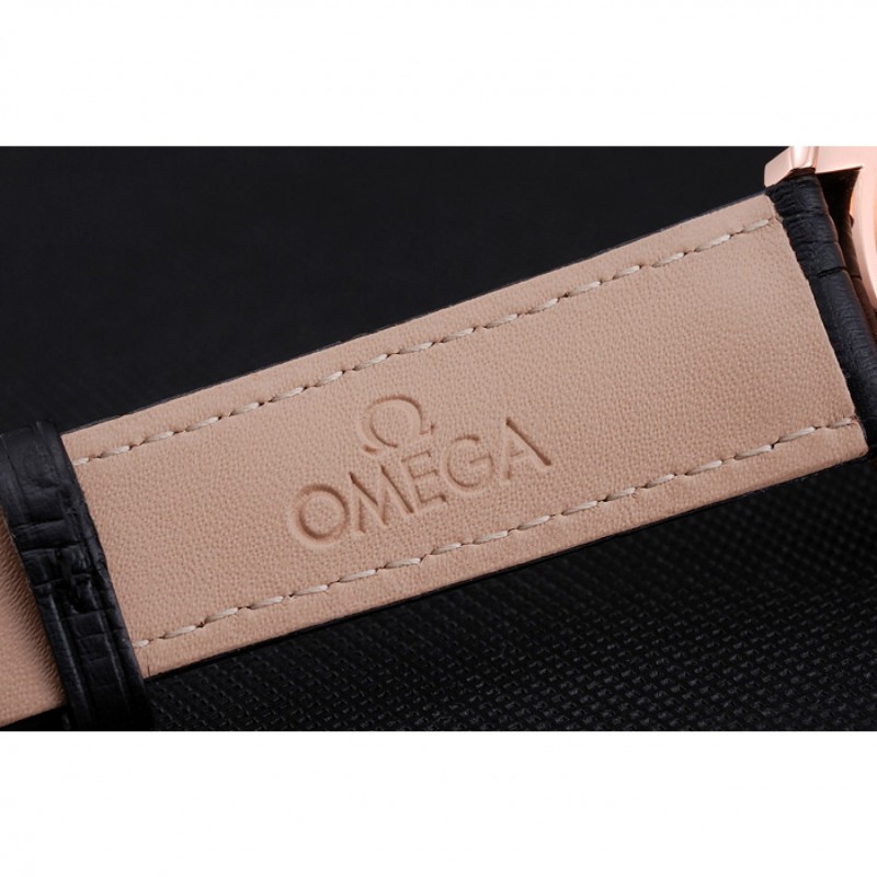 Bracelet:logo et bracelet en cuir Omega croco noir thermique avec Omega logo 18k sculpté or rose plaqué fermoir crochet boucle