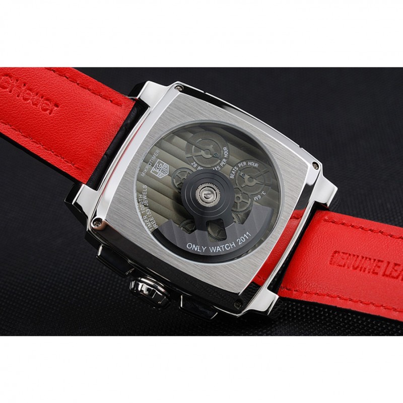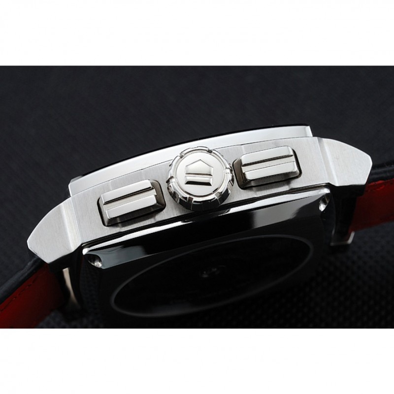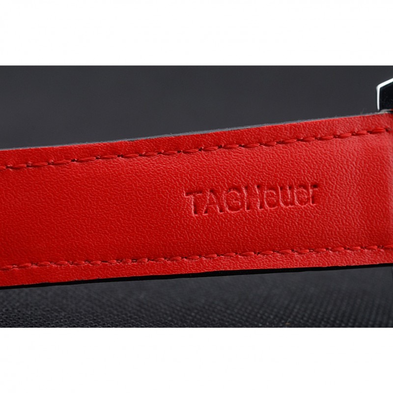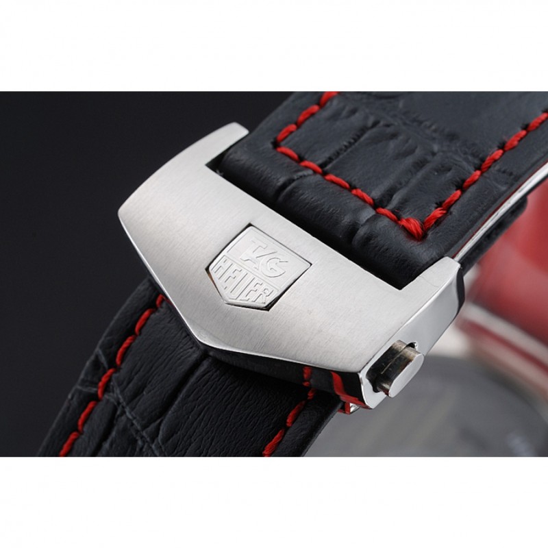 Bracelet:rouge doublure bracelet en cuir noir avec coutures rouges et Tag Heuer logo gravé en acier inoxydable brossé push-ouverture du rabat en boucle