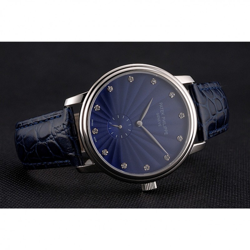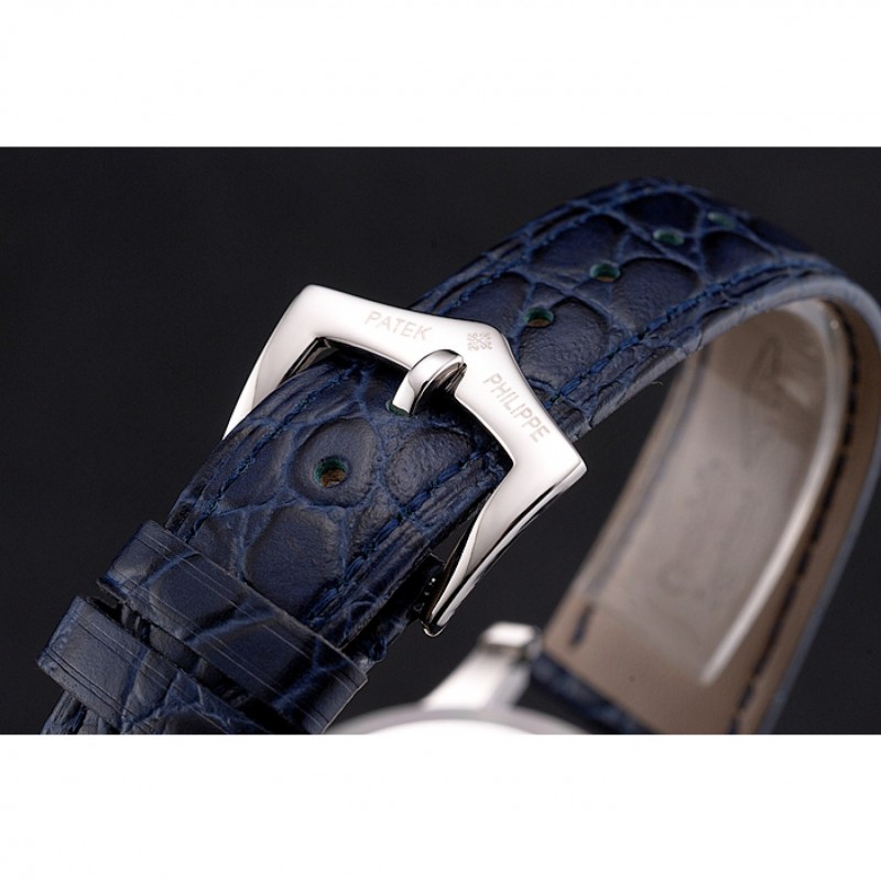 Bracelet:Patek Philippe et chaleur estampillage bleu bracelet en cuir de crocodile avec Patek Philippe et logo gravé fermoir en acier inoxydable poli crochet boucle