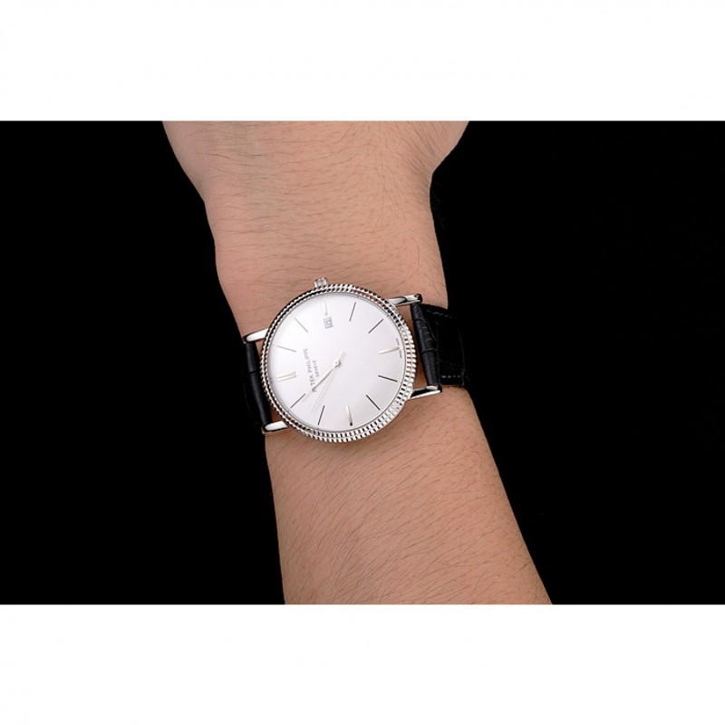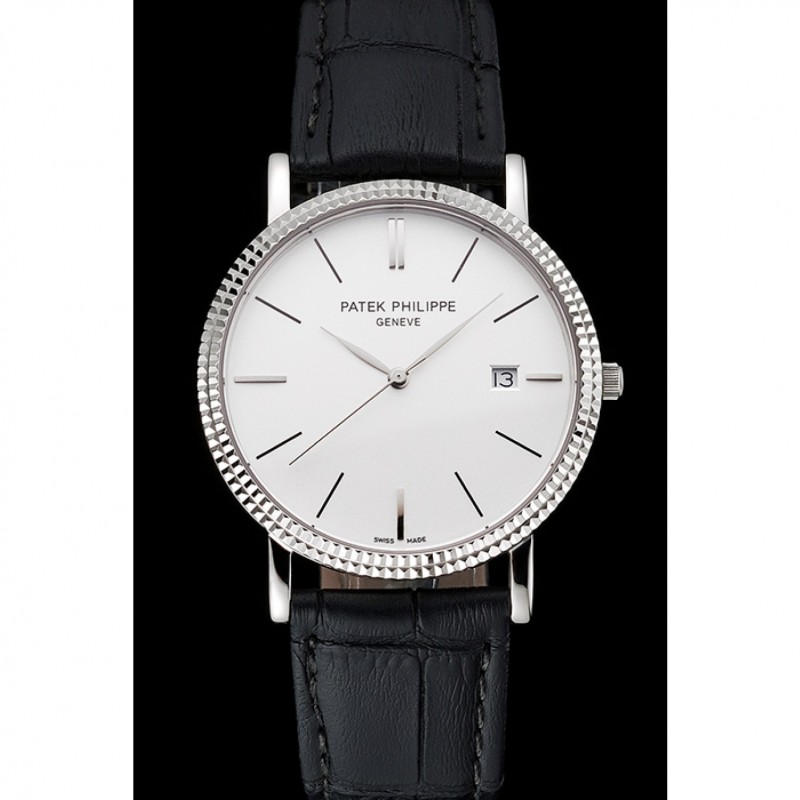 Patek Philippe Calatrava cadran blanc nervuré Bezel Boîtier en acier inoxydable Bracelet en cuir noir