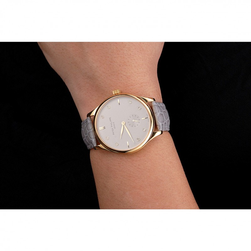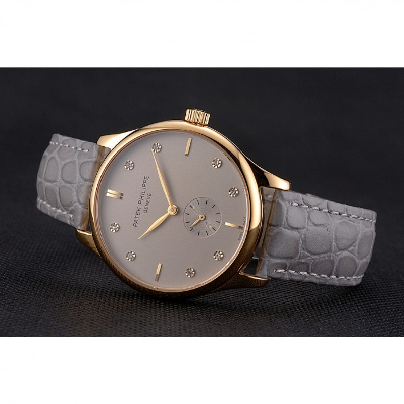 Bracelet:Patek Philippe et logo chaleur embossé bracelet crocodile en cuir gris avec Patek Philippe et le logo inscrit or jaune 18 carats plaqué fermoir crochet boucle