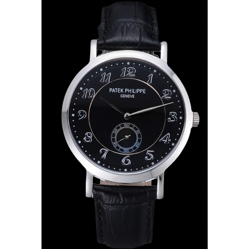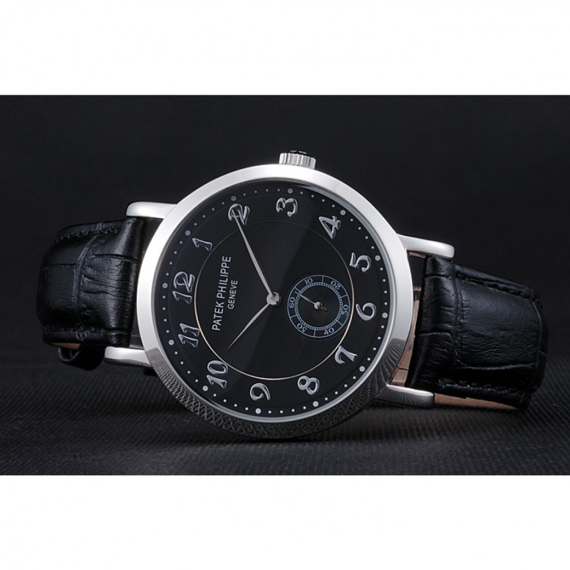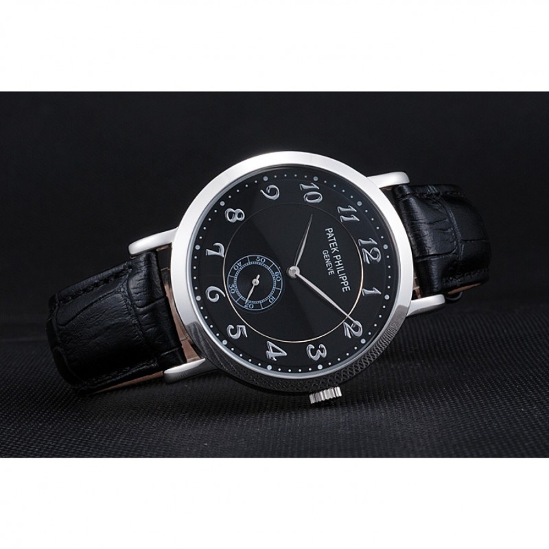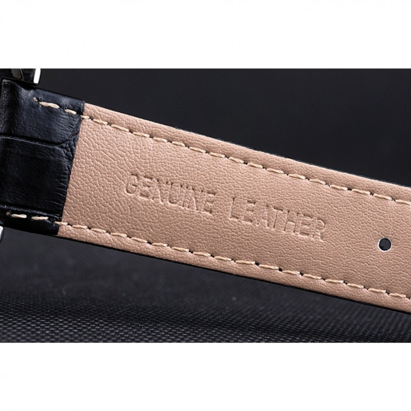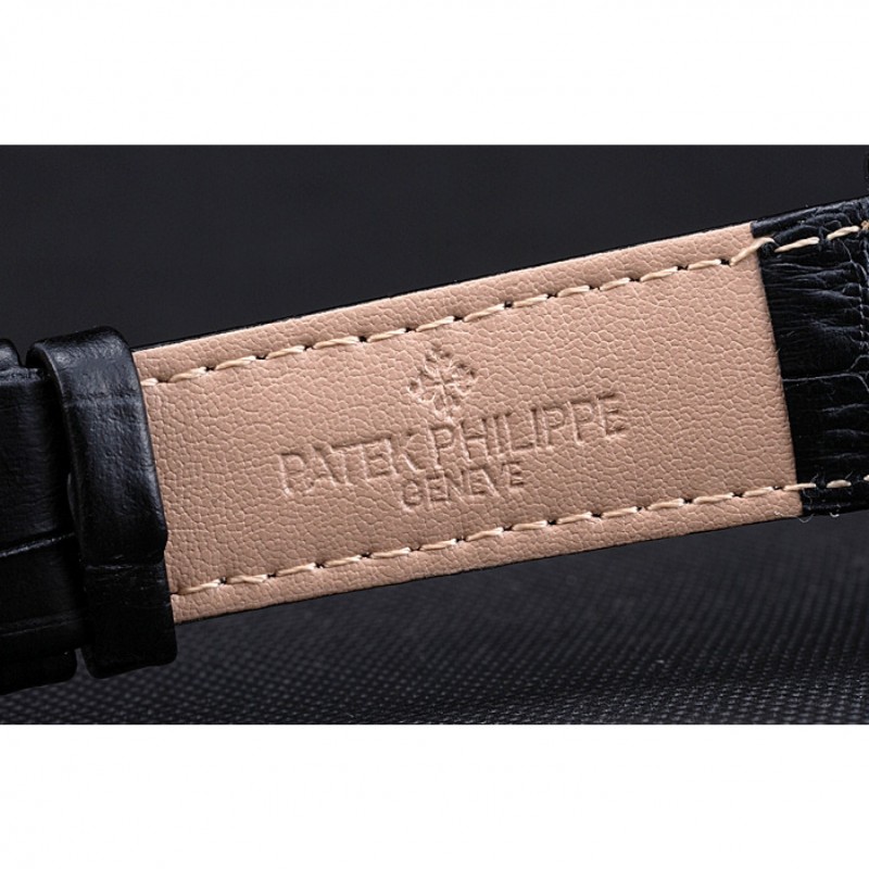 Bracelet:Patek Philippe Geneve chaleur en relief crocodile noir bracelet en cuir avec Patek Philippe et logo gravé fermoir crochet boucle en acier inoxydable poli