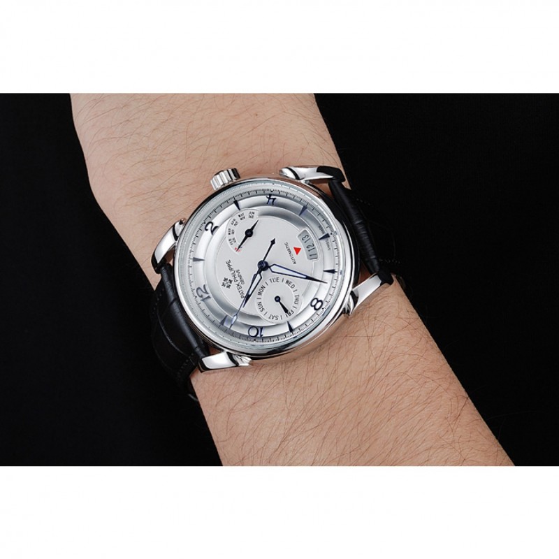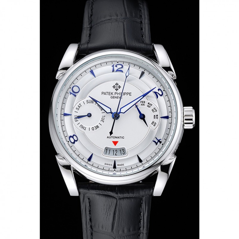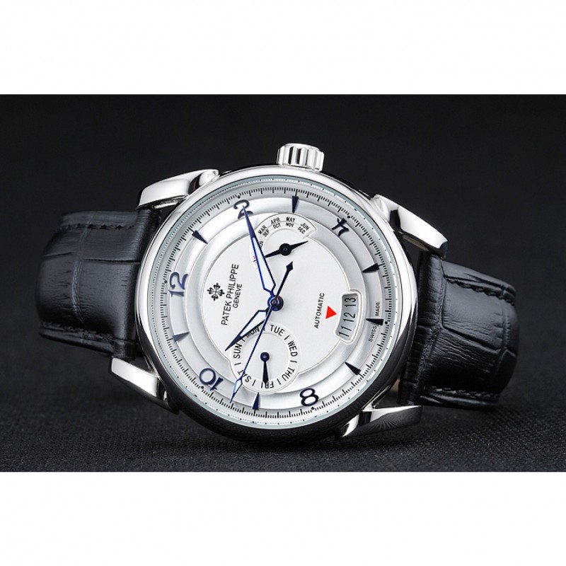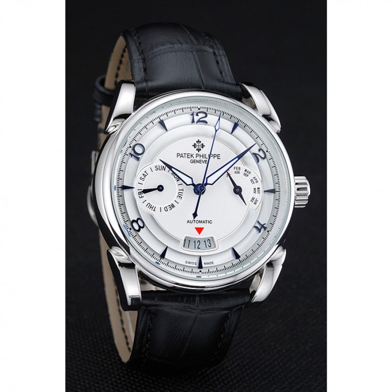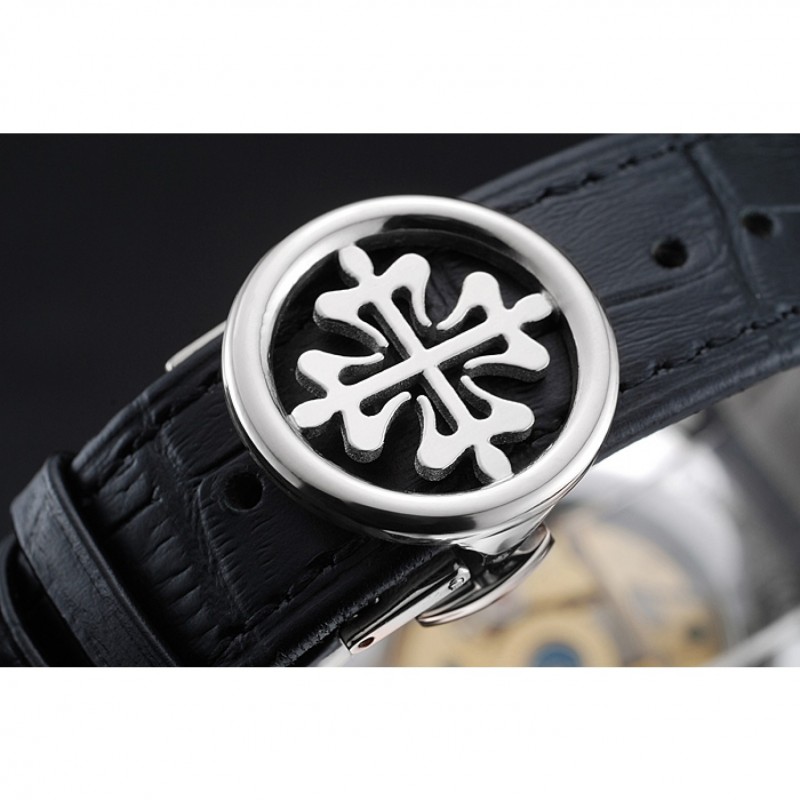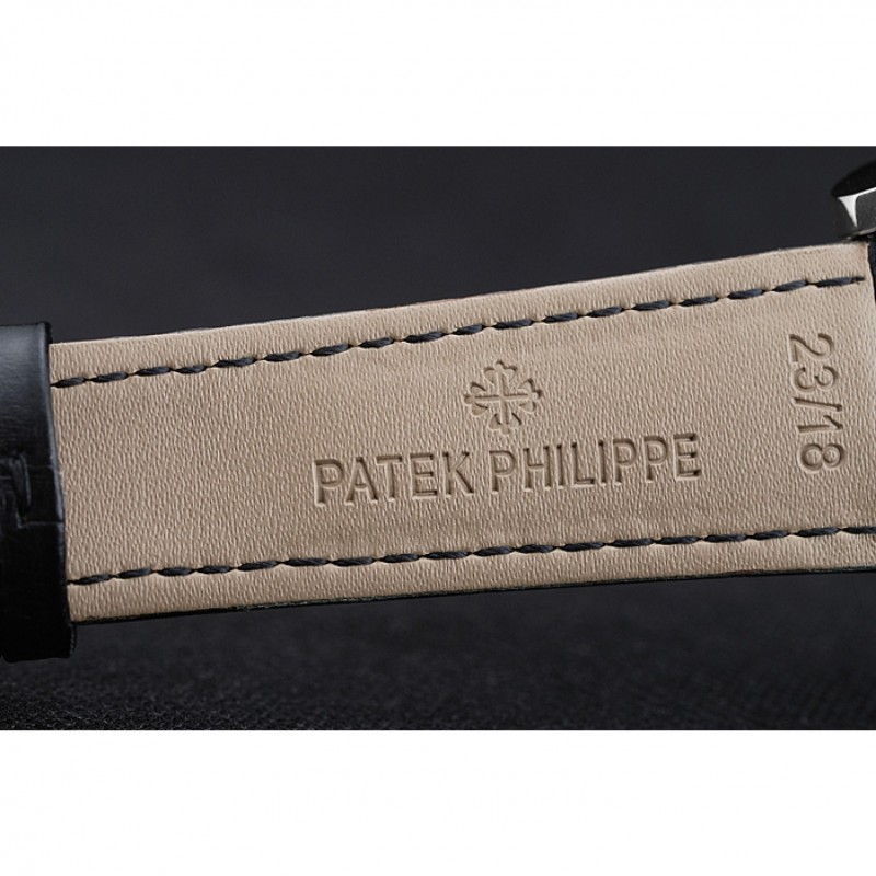 Bracelet:Patek Philippe et logo chaleur bracelet en cuir crocodile noir gravé Patek Philippe logo gravé fermoir crochet-boucle en acier inoxydable poli