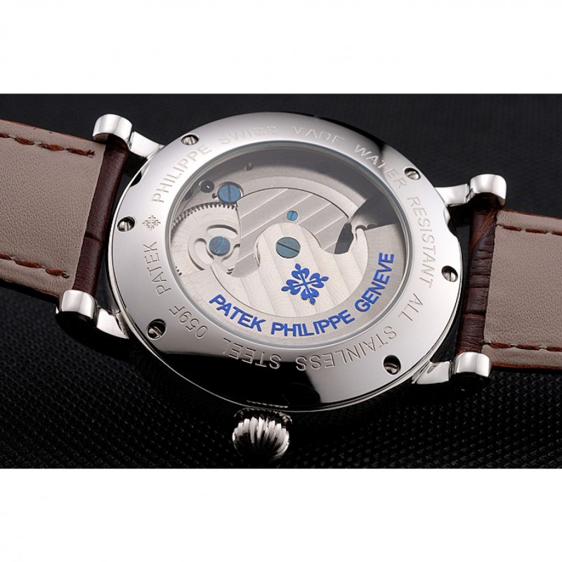 Retour:vissé en acier inoxydable poli acier arrière avec transparents mécanique de révélateur avant et gravure Patek Philippe Geneve