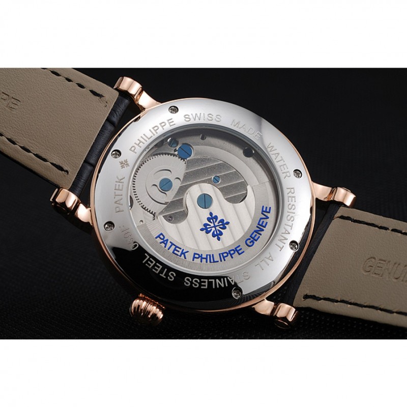 Retour:vissé en acier inoxydable poli de retour avec transparents mécanique de révélateur avant et gravure Patek Philippe Geneve