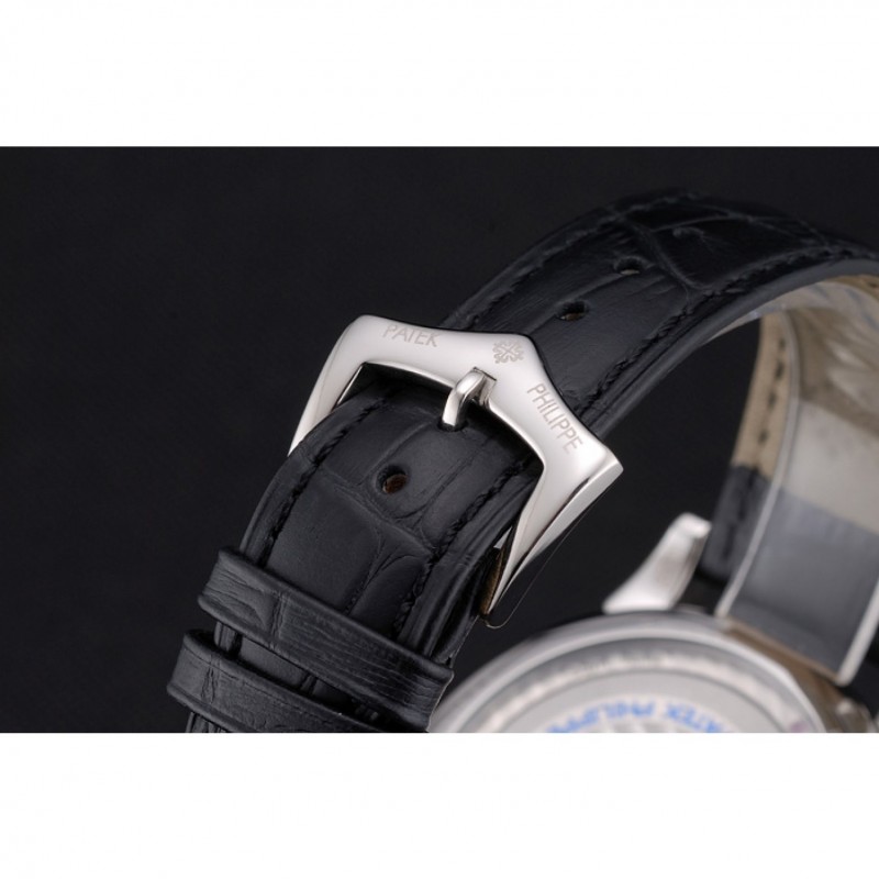 Bracelet:Patek Philippe Geneve chaleur bracelet en cuir crocodile noir en relief avec logo et Patek Philippe inscrit en acier inoxydable poli fermoir crochet-boucle
