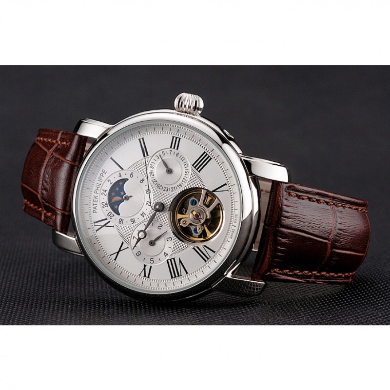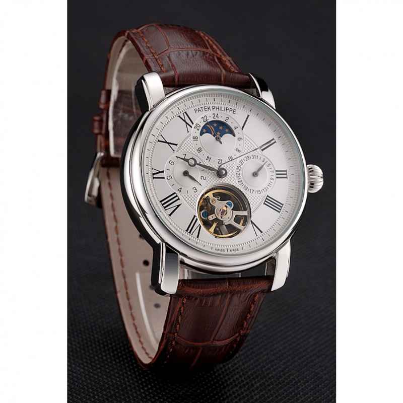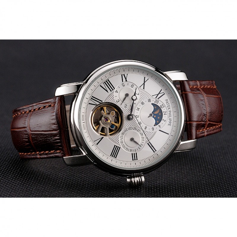 Patek Philippe Grand Complications Moonphase Calendrier perpétuel Tourbillon Cadran Blanc Boîtier en acier inoxydable bracelet en cuir brun
