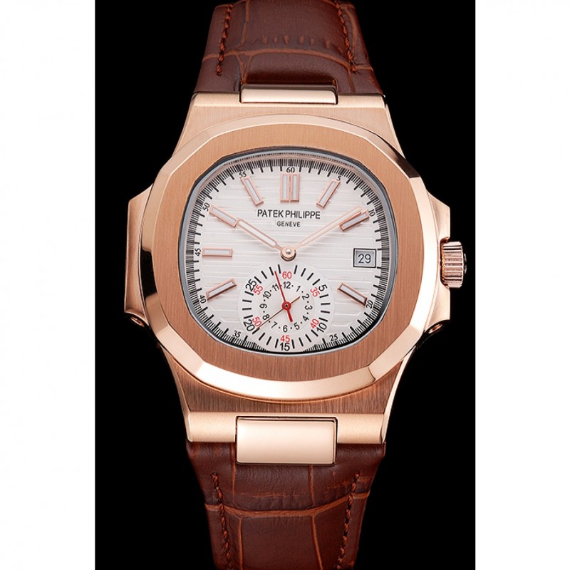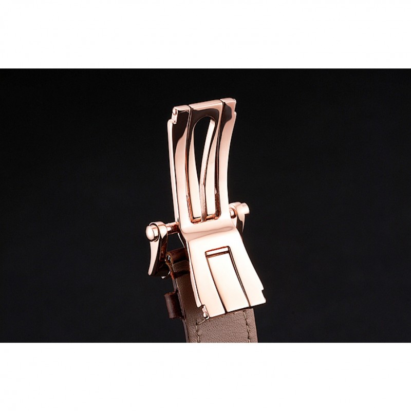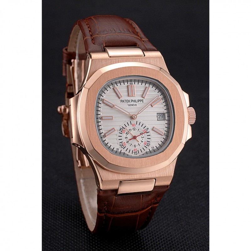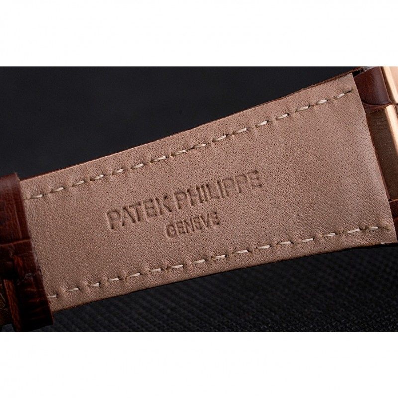 Bracelet:Patek Philippe Geneve chaleur bracelet en cuir de crocodile brun relief avec Nautilus gravé 18k rose plaqué or fermoir à boucle