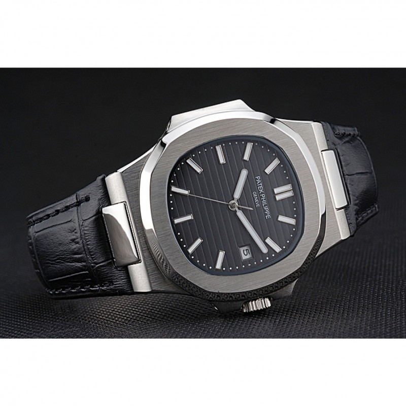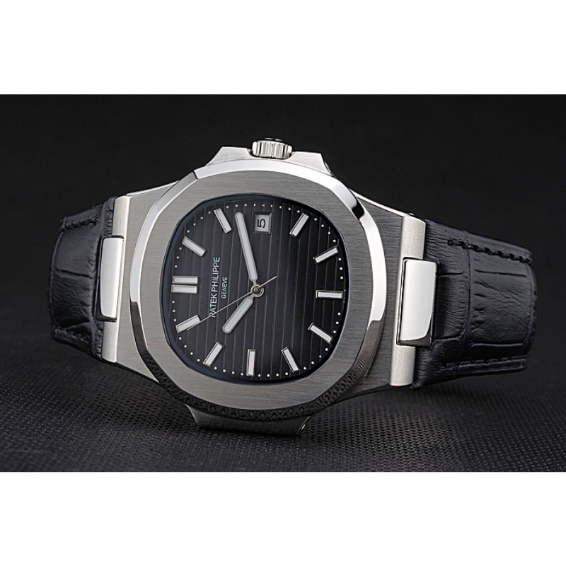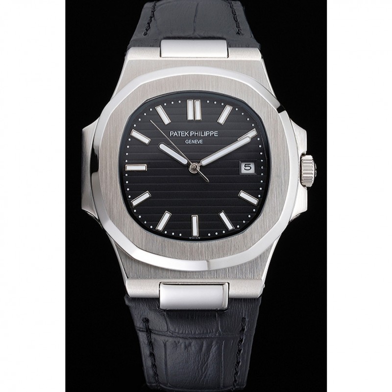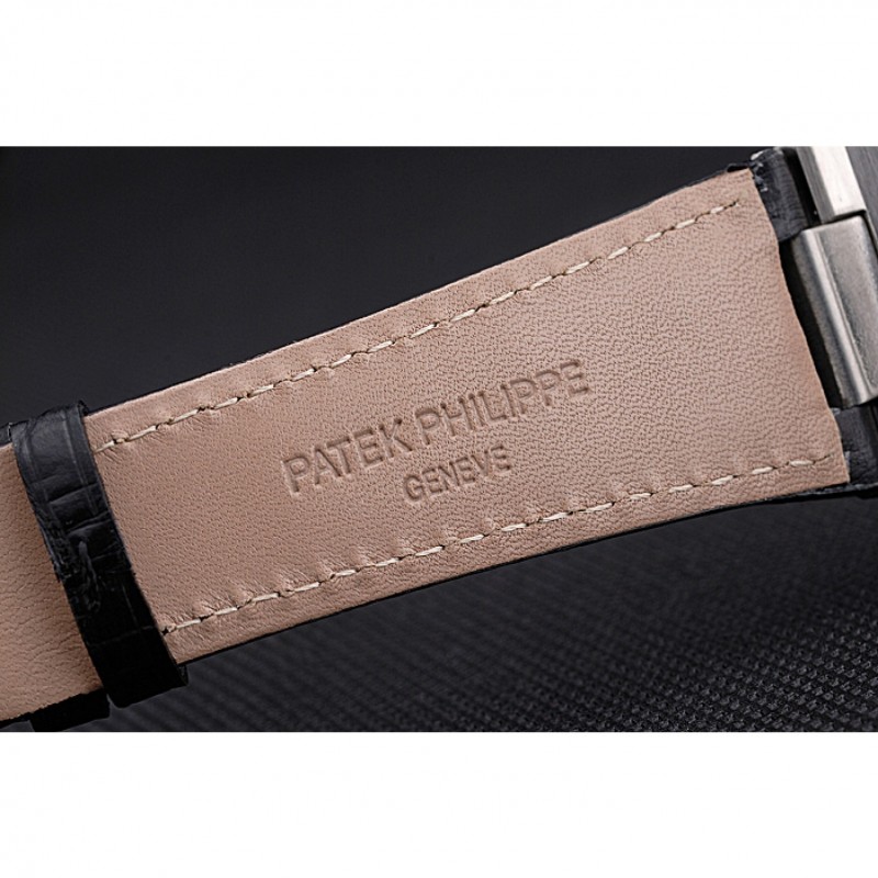 Bracelet:Patek Philippe Geneve chaleur bracelet en cuir crocodile noir en relief avec Nautilus gravé en acier inoxydable poli fermoir crochet-boucle
