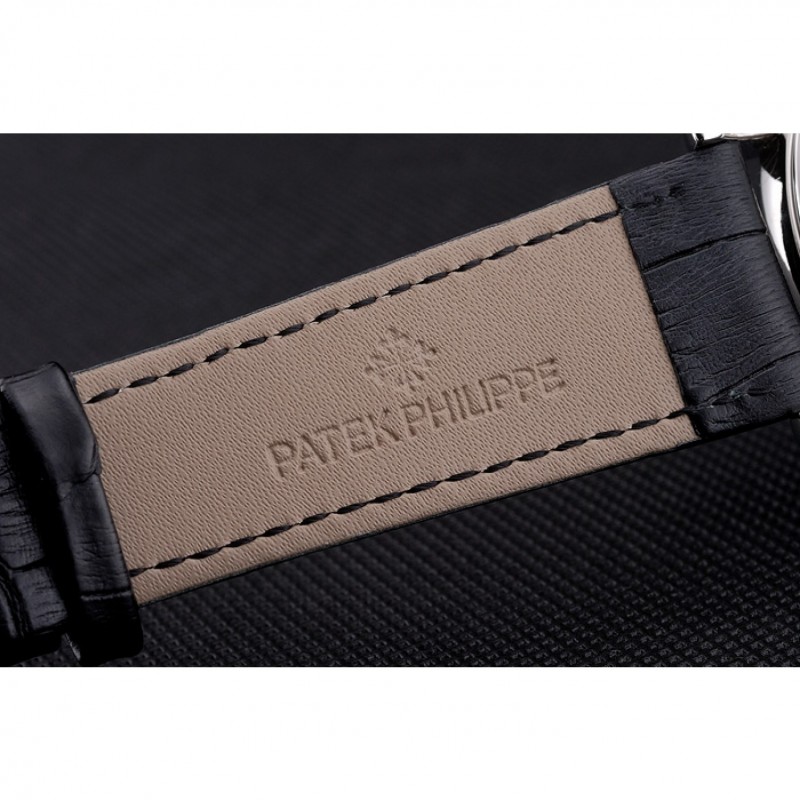 Bracelet:Patek Philippe Geneve chaleur en relief bracelet en cuir crocodile noir avec logo et Patek Philippe inscrit en acier inoxydable poli fermoir crochet-boucle