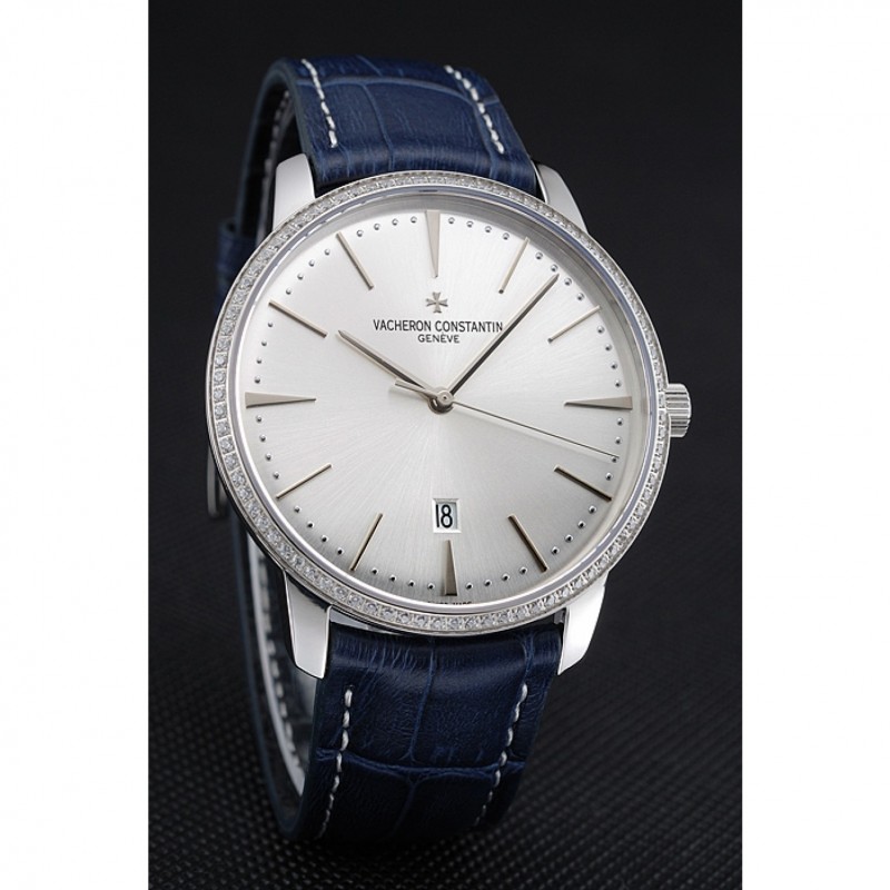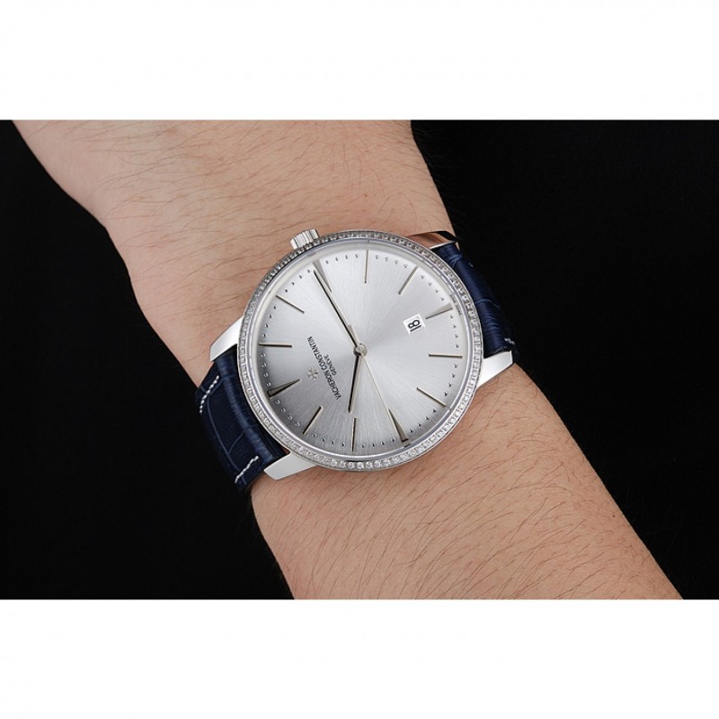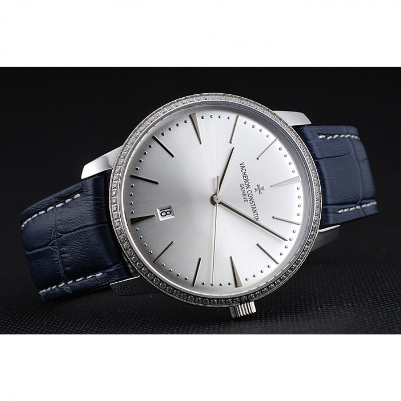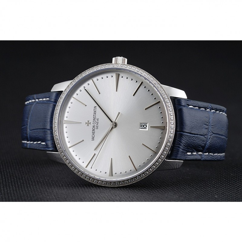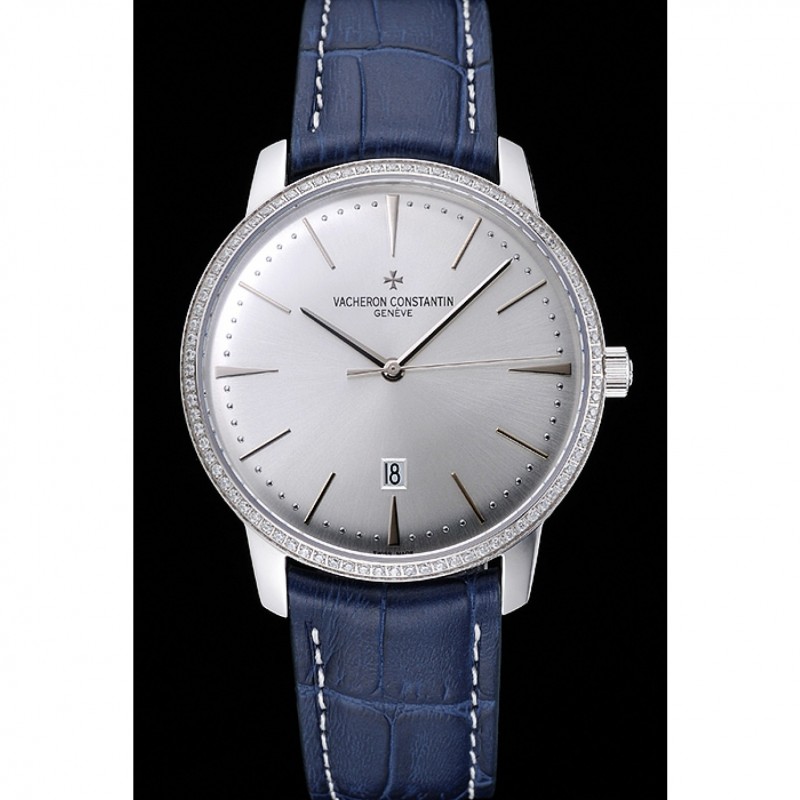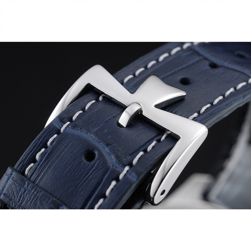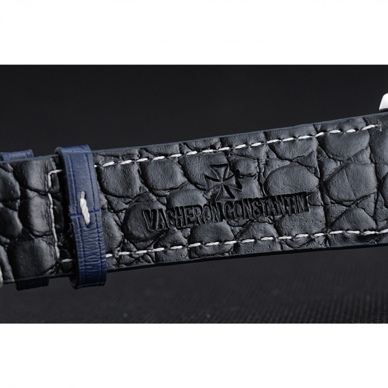 Bracelet:Vacheron Constantin et bracelet en cuir de crocodile bleu relief chaleur logo avec coutures fil blanc et Vacheron Constantin logo sculpté fermoir crochet-boucle en acier inoxydable poli