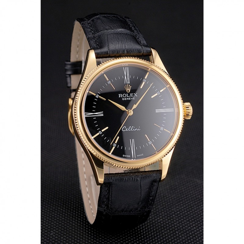 SS Replique Montre Swiss Rolex Cellini cadran noir chiffres romains boîtier en or Bracelet en cuir noir