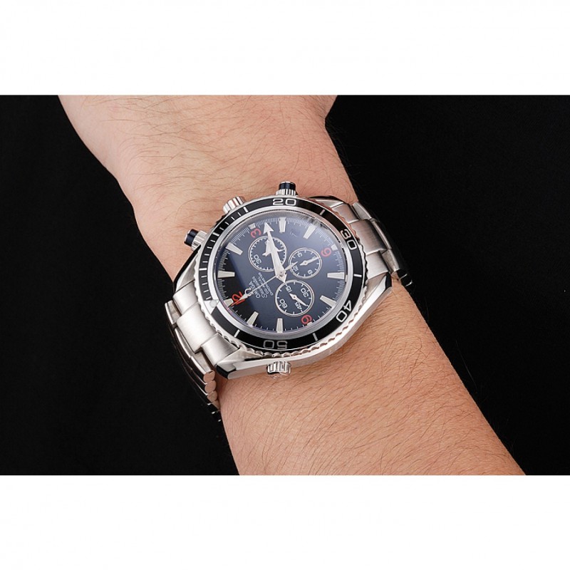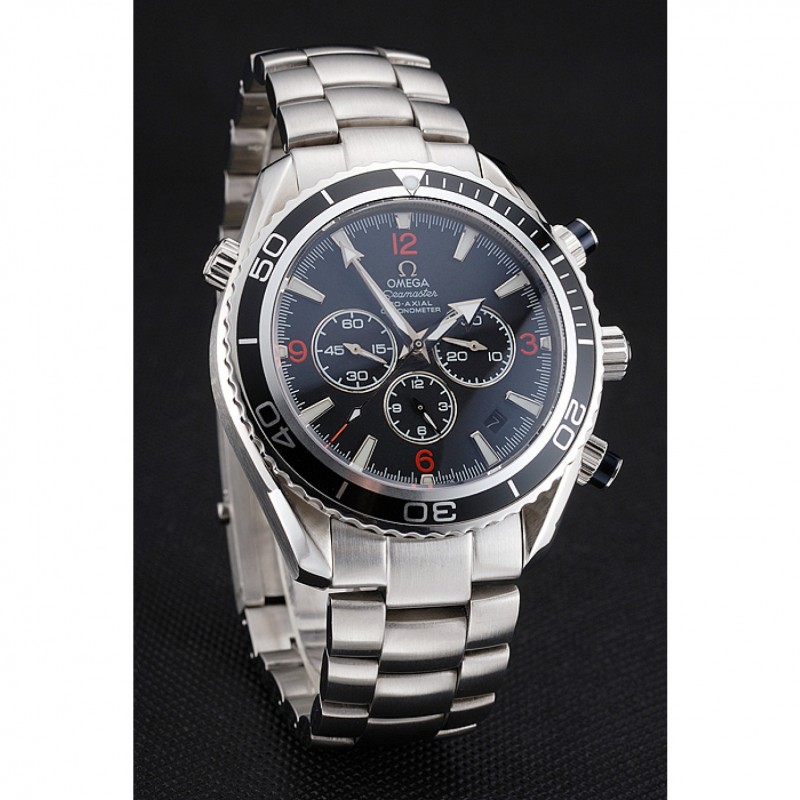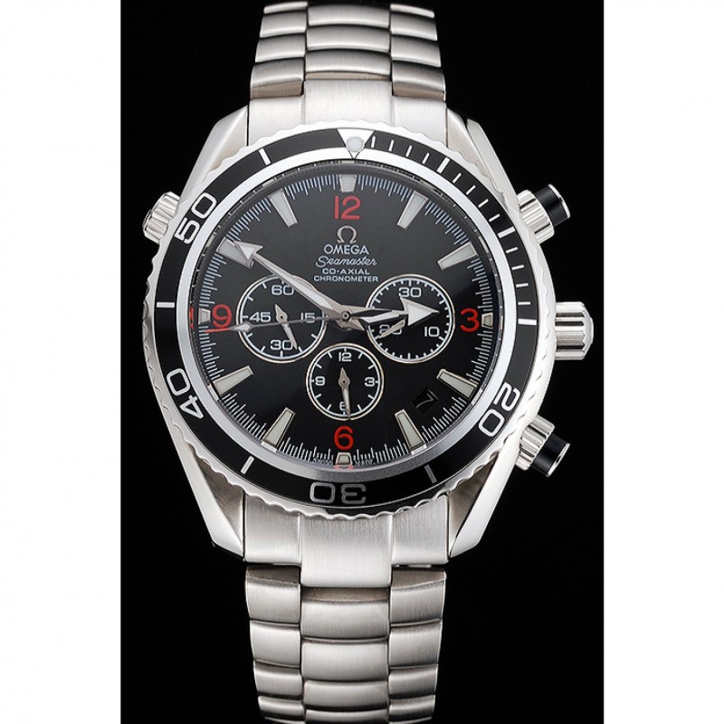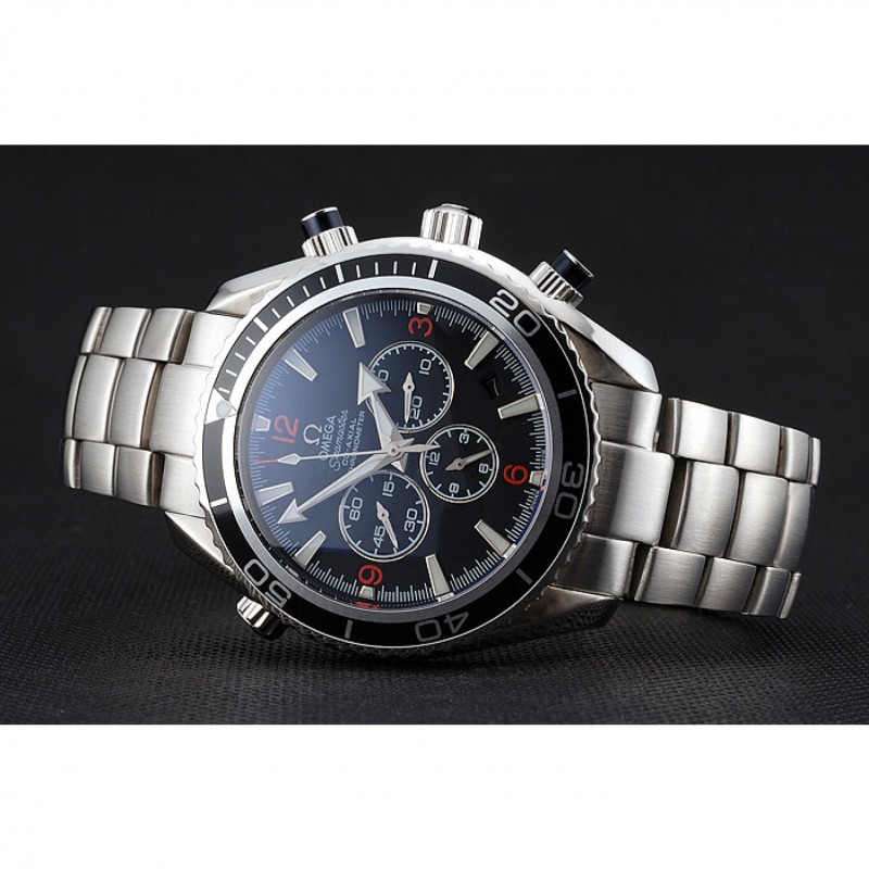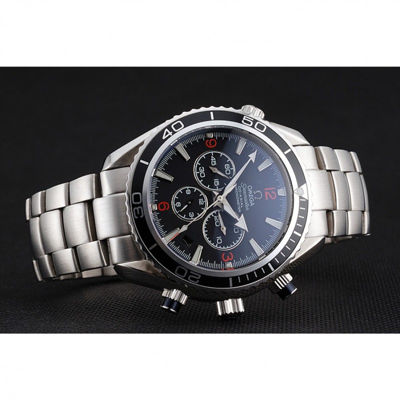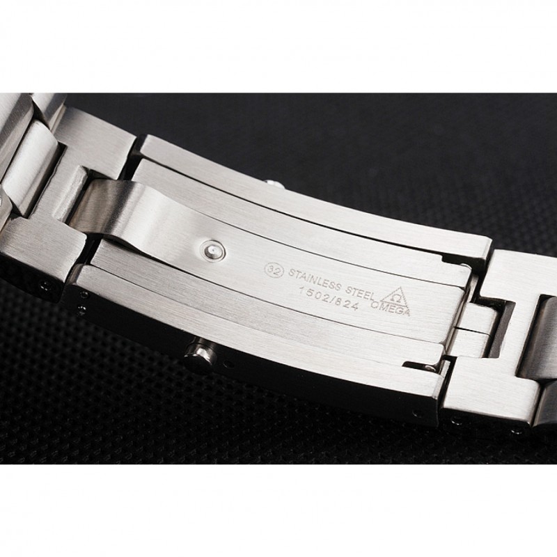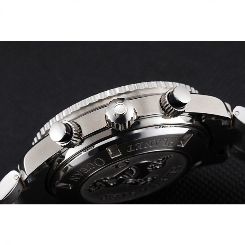 Couronne:logo Omega sculpté couronne en acier inoxydable poli cutwork avec une couronne à bouton-poussoir de garniture en céramique noire de chaque côté de celui-ci, plus une couronne cutwork de l’autre côté