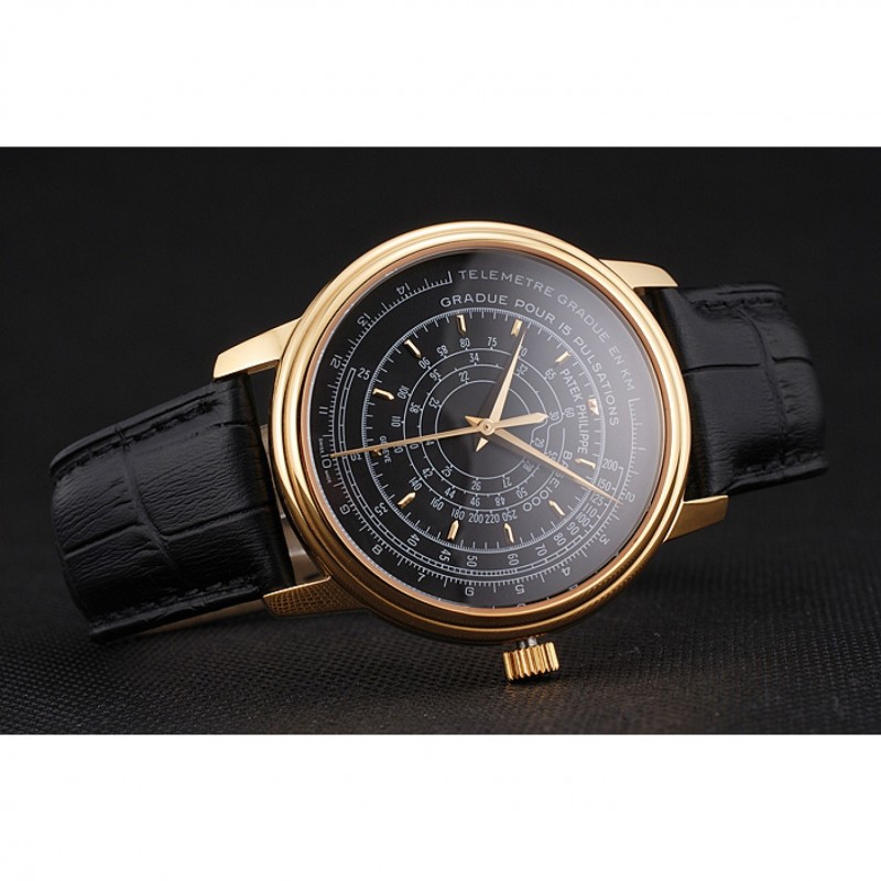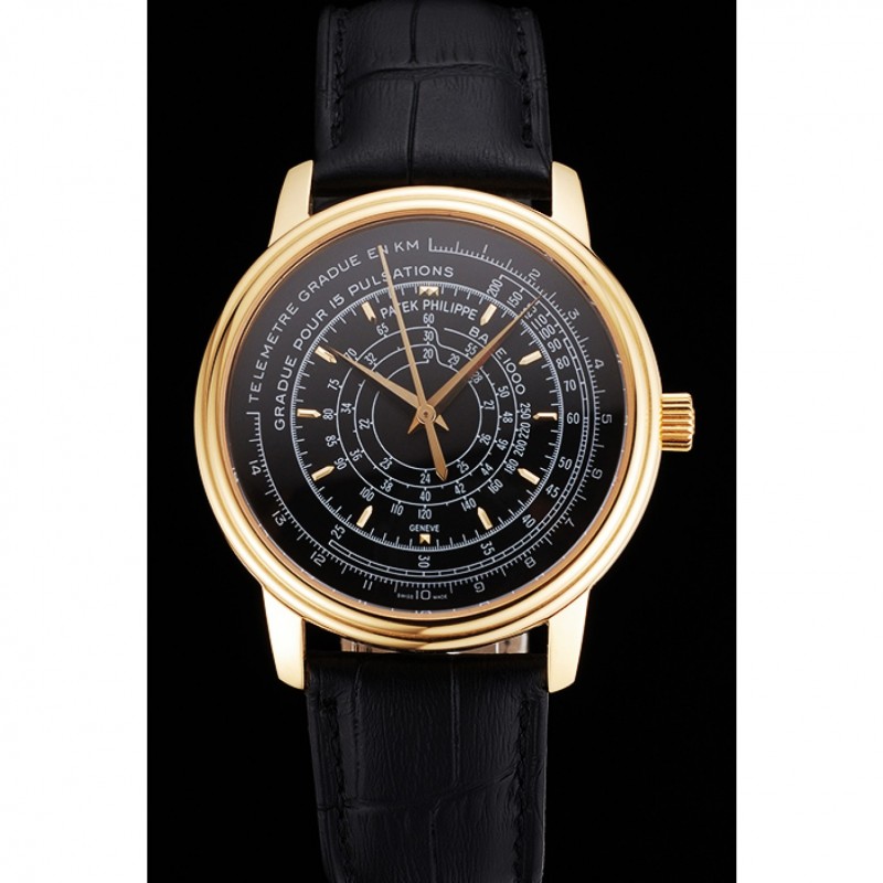 Bracelet:Patek Philippe Geneve chaleur bracelet en cuir crocodile noir en relief avec 18k plaqué or jaune fermoir crochet-boucle