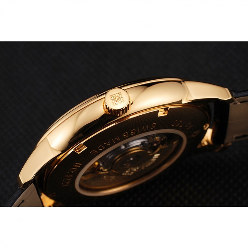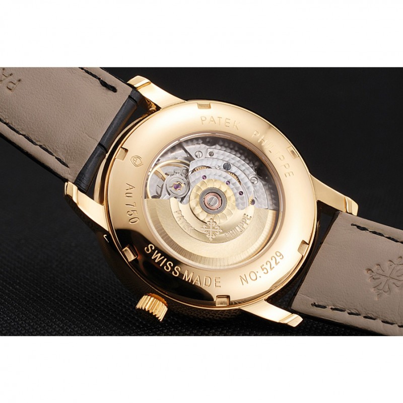 Retour:18k plaqué or jaune enfichable à l’arrière avec des gravures Patek Philippe et mécanique révélant transparent fenêtre